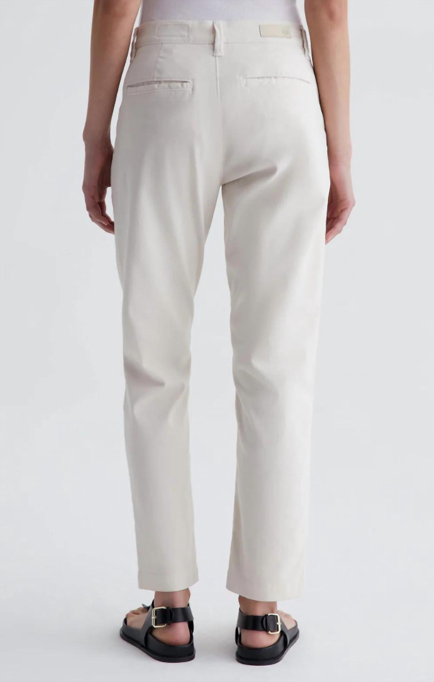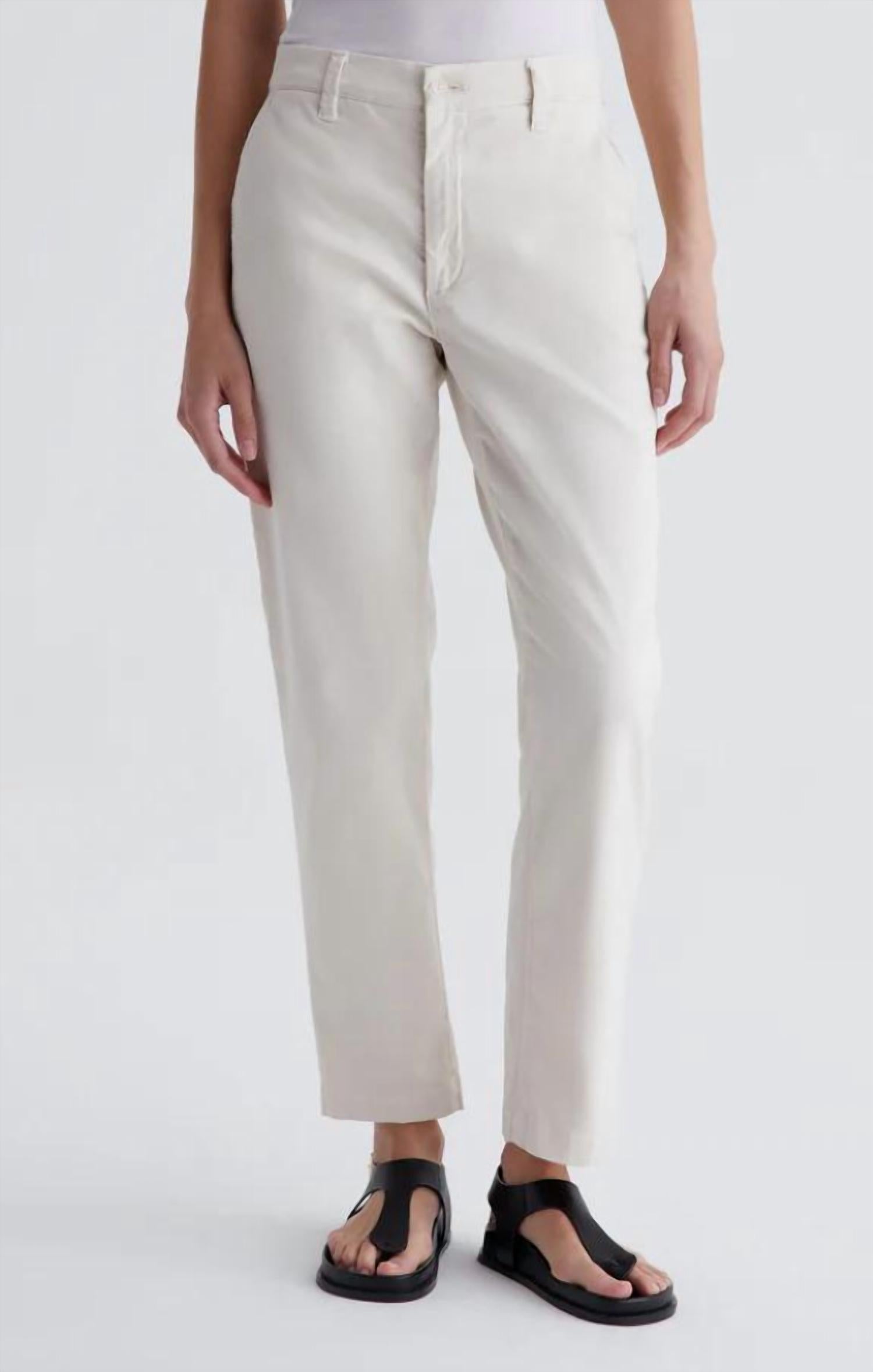 Discover the Caden Tailored Trouser by AG Jeans, a chic and versatile piece designed for both work and weekend wear. This relaxed fit trouser features a mid-rise waist with a straight leg and a cropped 27" inseam, crafted from a sumptuous stretch broken twill blend of 54% Cotton, 43% Lyocell, and 3% Elastane. It includes slant front pockets and welt back pockets to enhance its functional elegance. Closure: Button closure. Color: Opal Stone. Model is wearing size 25 with measurements: Front Rise: 9 1/2", Knee Opening: 15", Bottom Opening: 12".