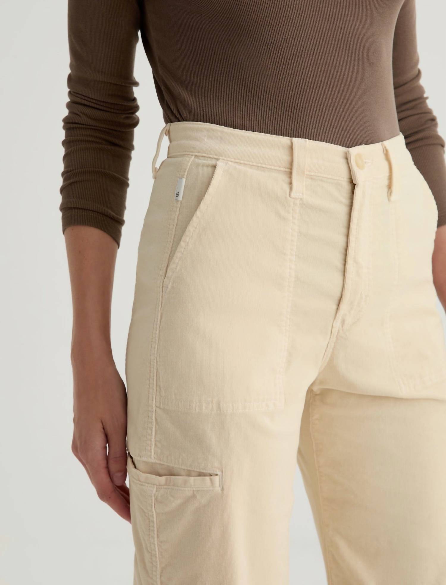 Fit to perfection, we love these high-waist jeans and you will too. Introducing the Hazal Corduroy High-rise Utility Barrel Jeans by AG Jeans, a stylish blend of modern design and workwear practicality for women. With a relaxed fit, these high-rise jeans are crafted from a soft cotton blend of 98% cotton and 2% elastane and feature a button closure for effortless wear. Characterized by their solid opal stone color and functional pocketing, they have a voluminous leg that measures 38 inches in length. For easy care, simply machine wash cold and tumble dry.
