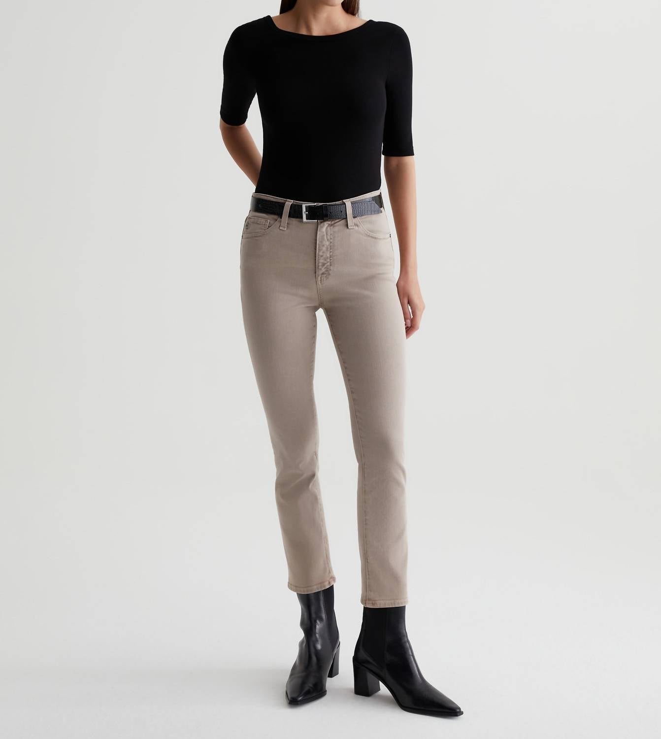 Pair these straight leg jeans with flats, sandals or even heels! You can't go wrong. Elevate your wardrobe with the AG Jeans Mari Crop Mid-rise Slim Straight Jeans in a chic sulfur taupe hue. Designed for women, these jeans feature a slim fit with a straight leg style and a convenient zip closure. They are crafted from AG’s exclusive Cloud Soft Denim™ with a cotton blend, offering a hyper-soft stretch in a lightweight 9.7 oz fabric that becomes softer with each wear. With a mid rise of 9.75 inches, an inseam of 27 inches, and a bottom opening of 12.75 inches, these jeans promise a flattering silhouette. material: 56% Cotton, 19% Modal, 18% Lyocell, 6% Polyester, 1% Elastane. Care instructions: Machine wash and tumble dry. Model is wearing size 26.
