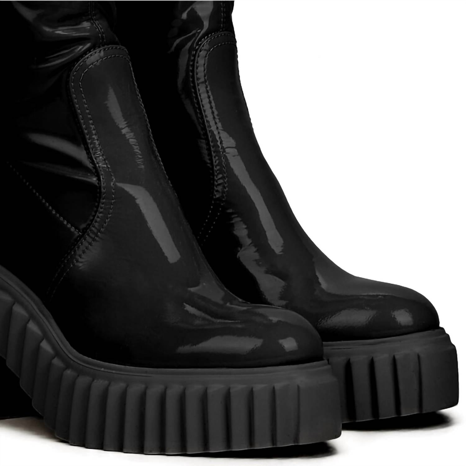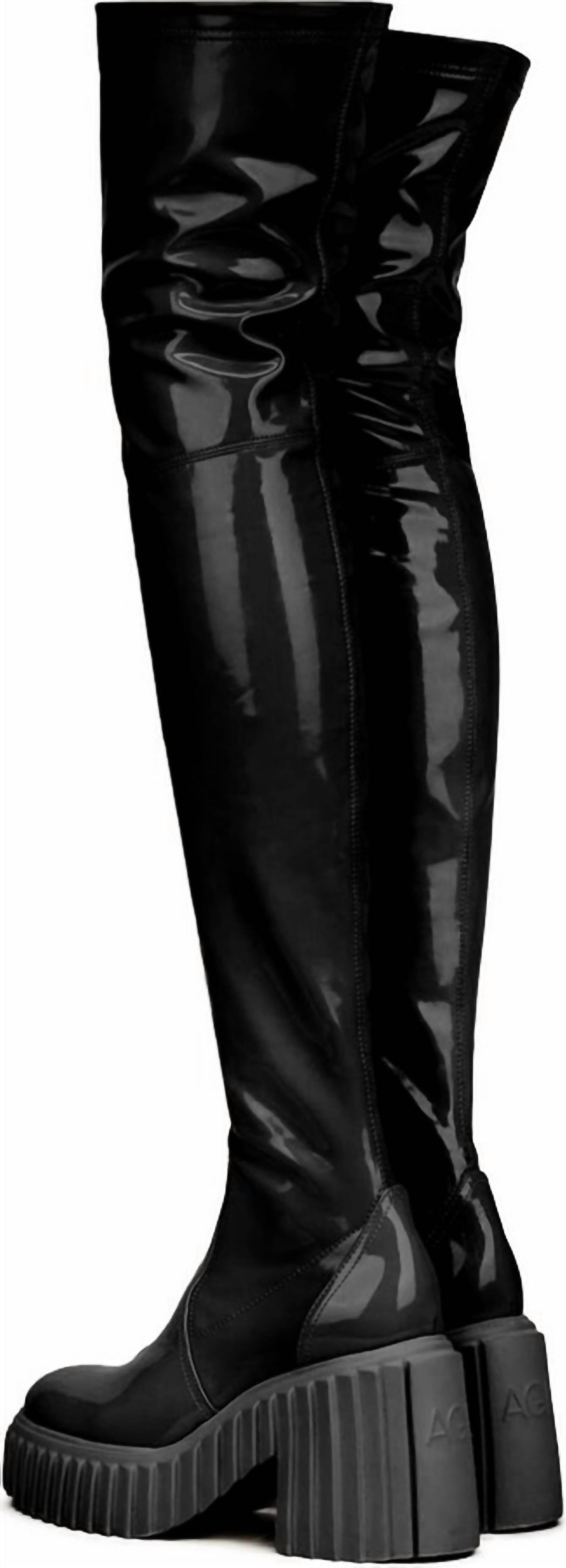 These over the knee boots are equal parts classic and cool. Introducing the Tiggy Stretch Over The Knee Boots by AGL, showcasing a sleek black patent finish perfect for your evening events. These are designed with a round toe and block heel, featuring a striking over-the-knee silhouette with a chunky geo-textured platform. Material: Leather upper and lining with a rubber sole. Origin: Made in Italy. Heel height: 4" with a 1 1/2" platform, shaft measures 25 1/2", and has a 12" calf circumference.