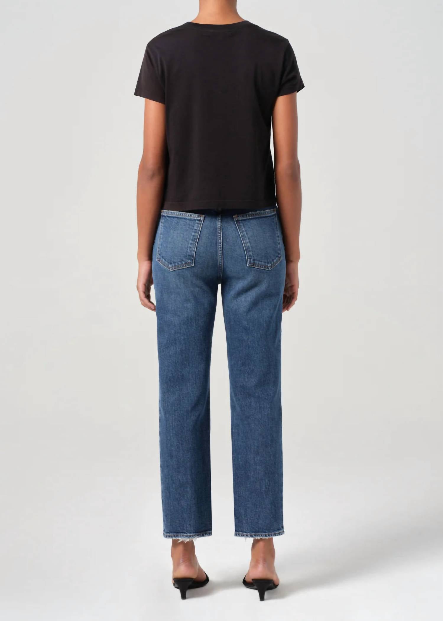 These must-have jeans are fit to perfection. Experience timeless style and comfort. Boast a flattering high-rise waist. Feature a close-fitting top block through the hips, flowing into a classic, straight leg with a cropped inseam. Made with regenerative cotton and a hint of stretch. Deliver unbeatable comfort. Completed with a button closure. Subtle whiskering on a saturated indigo solid pattern.