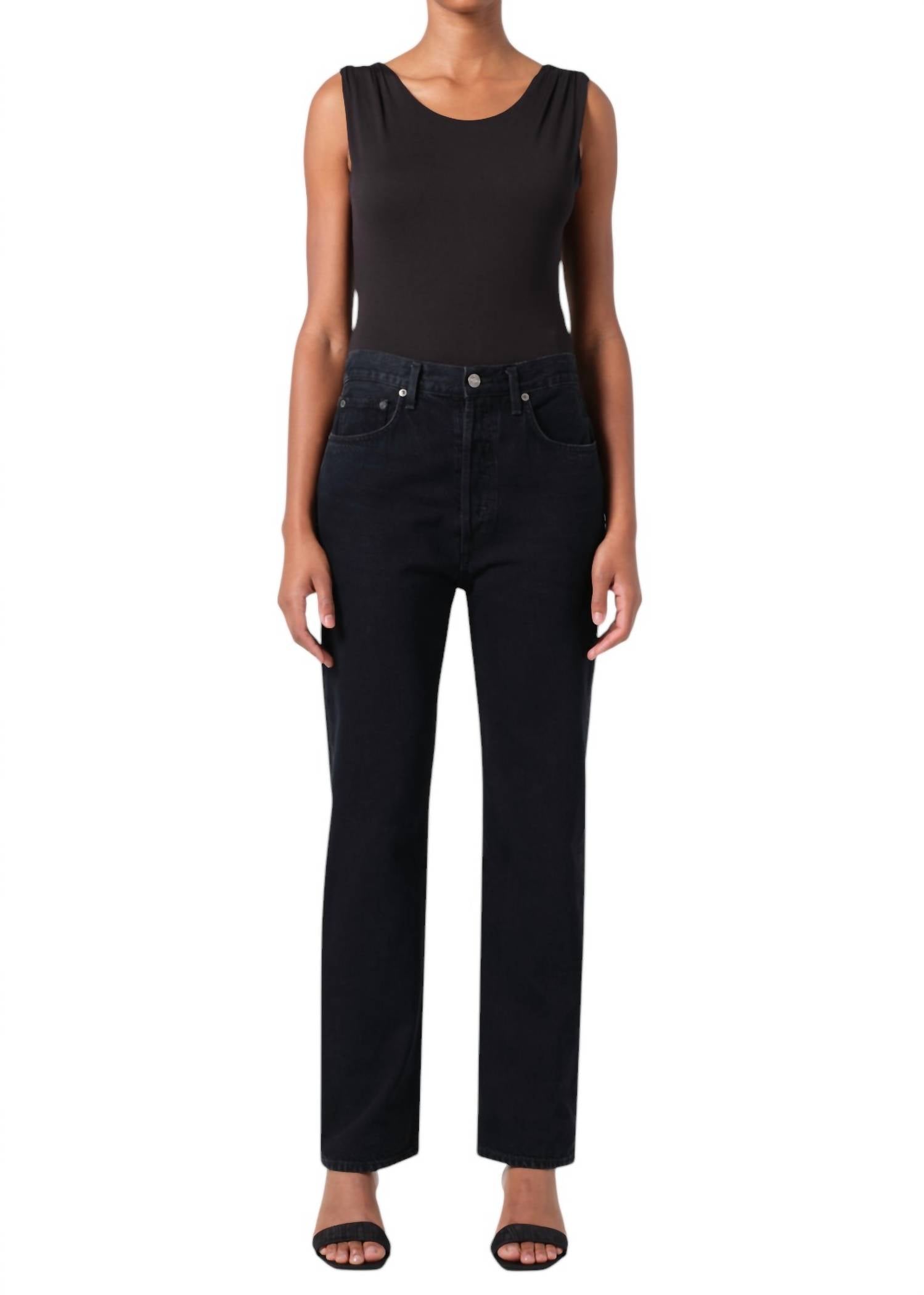 Discover the 90's Pinch Waist Jean by AGOLDE, where vintage style meets modern comfort. These jeans boast a high-rise waist with a 12.75-inch rise and a classic straight leg, finished with a full-length inseam of 29.5 inches. Made from 100% cotton denim, these jeans come in a deep, saturated crushed black that will only get softer with wear. With a button fly closure, manufactured in Turkey, these jeans are as stylish as they are durable. Care for them with machine wash cold instructions to maintain their vintage appeal.