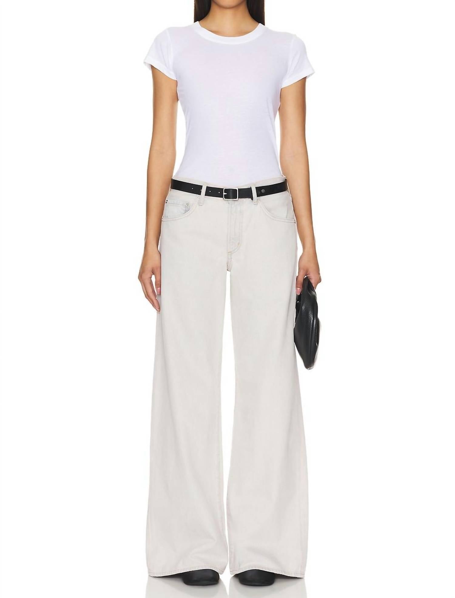 Just as cute as they are comfortable. Presenting the Clara Wide Leg Jean by AGOLDE in the vibrant Tarte color, expertly crafted with 100% regenerative cotton. Made in the USA, this denim piece features a zipper fly with button closure and a flattering wide leg style. The design includes a practical 5-pocket layout and concealed zipper cuffs, with measurements of 56 cm at the knee extending to 61 cm at the leg opening. Care is straightforward with a machine wash recommended for maintaining its quality and color.
