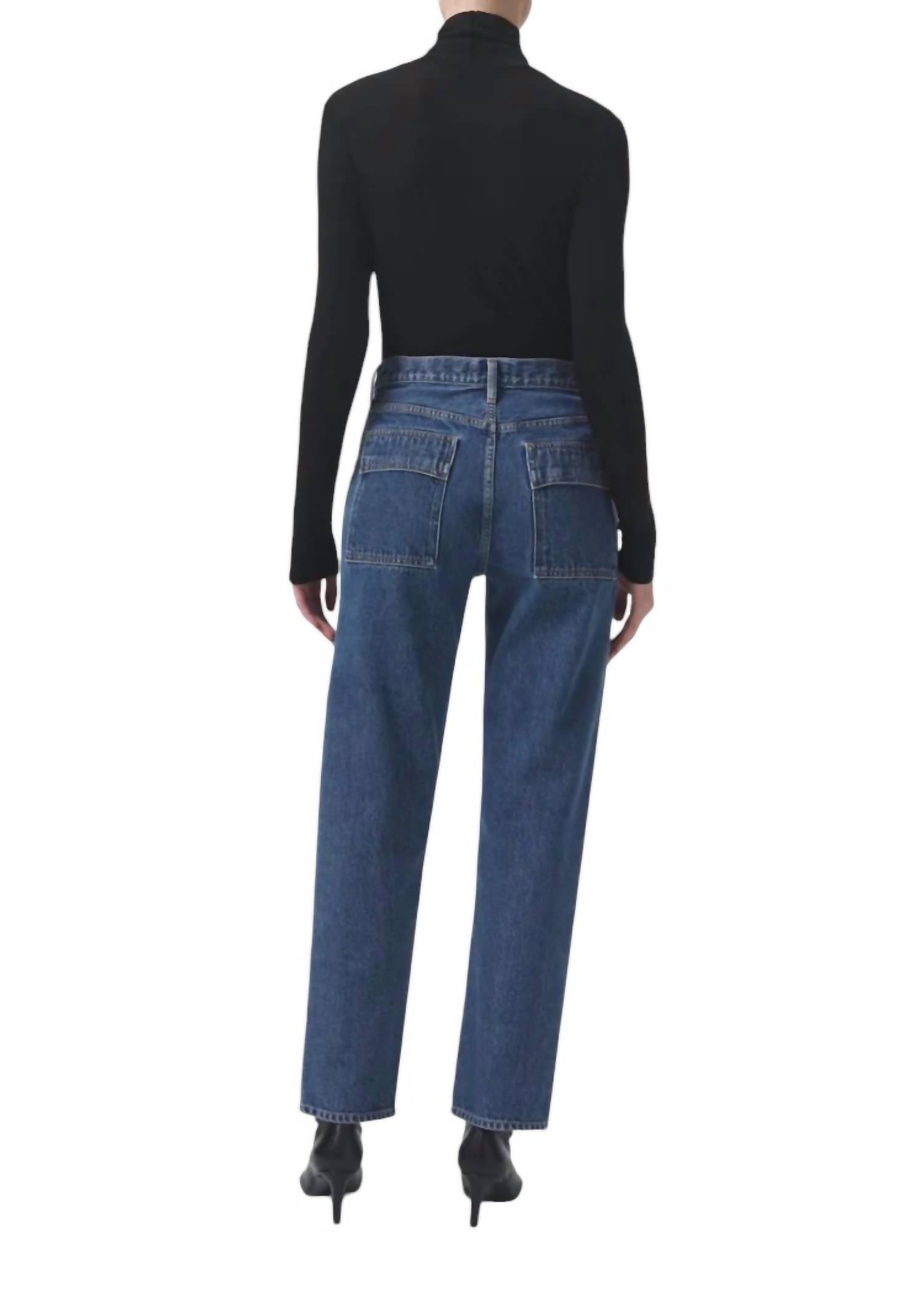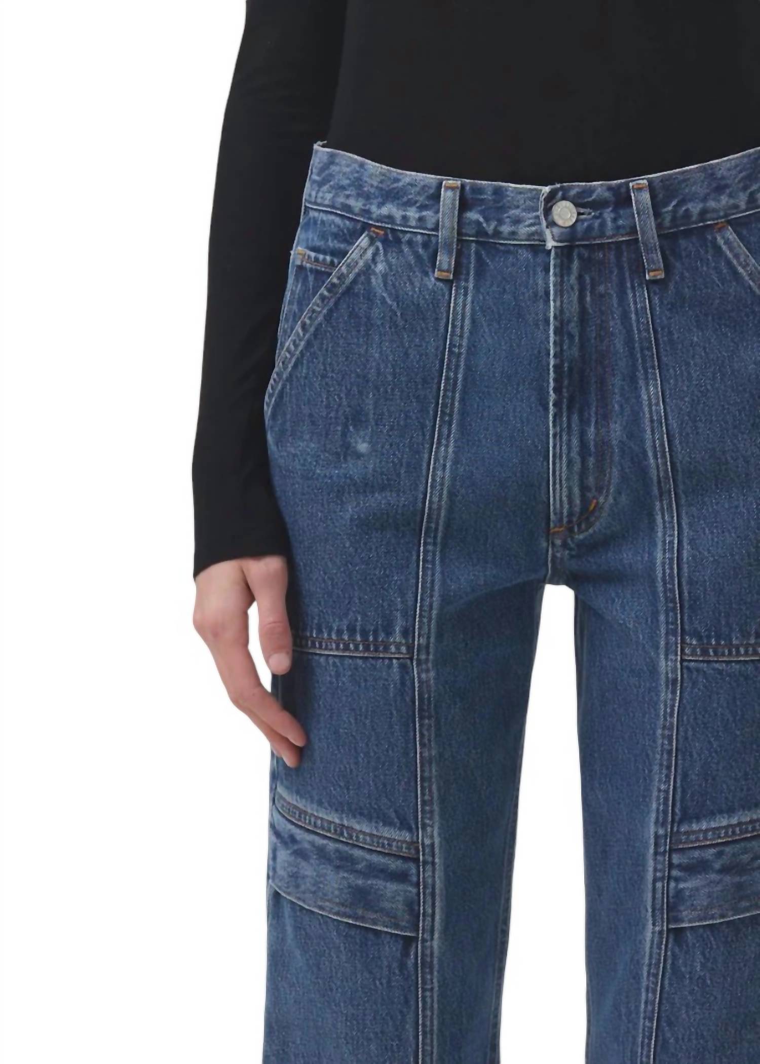 This classic straight leg jean has a perfect fit and goes with just about everything. These pants feature a high-rise waist, utilitarian inset pockets, and a sleeker cargo style silhouette. They have a zip fly and are made from 100% organic cotton. The rise is 12", inseam is 28.5", and the leg opening is 15.25". Machine wash cold. Imported.