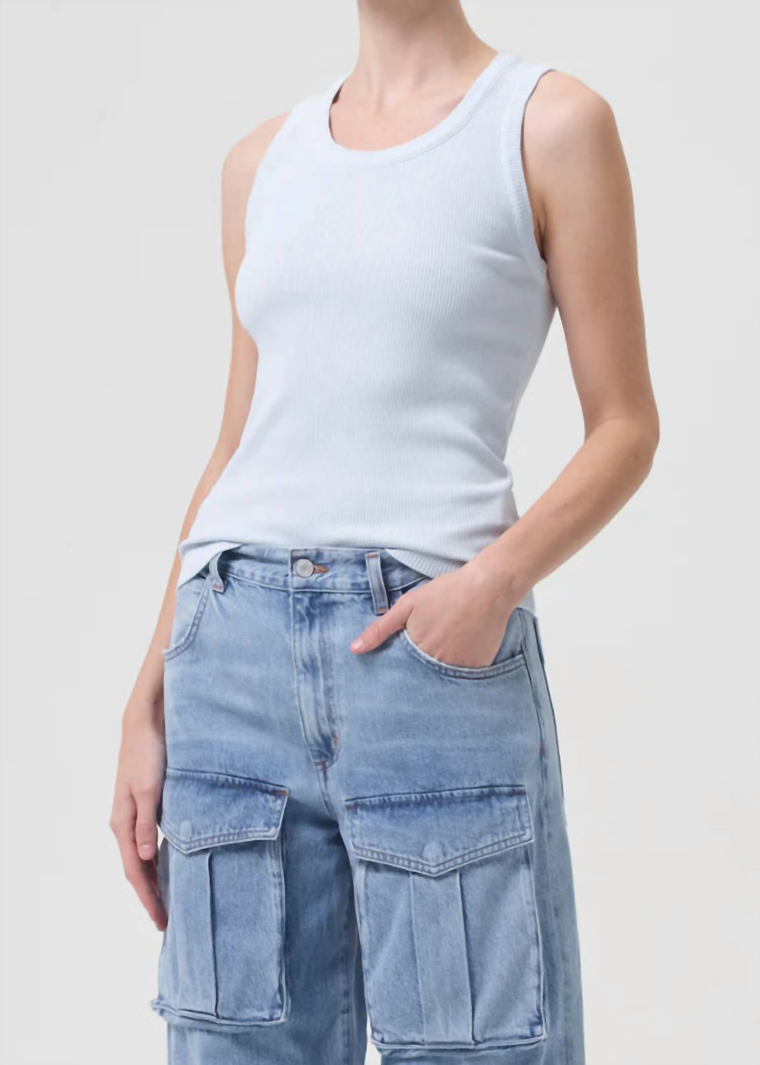 This classic tank top is perfect for layering and cute enough to wear on its own. Meet the Crewneck Tank Top by AGOLDE, a must-have for easy summer styling and vacation getaways. This women’s Y2K-inspired tank in a super light baby blue offers a sleeveless, close-to-body fit. Made from textured organic chunky cotton rib, it provides a supportive yet breathable feel with its flattering U-shape neckline. Designed for versatility, it features a convenient pull-on closure, making it an ideal choice for layering or wearing solo with your favorite bottoms.