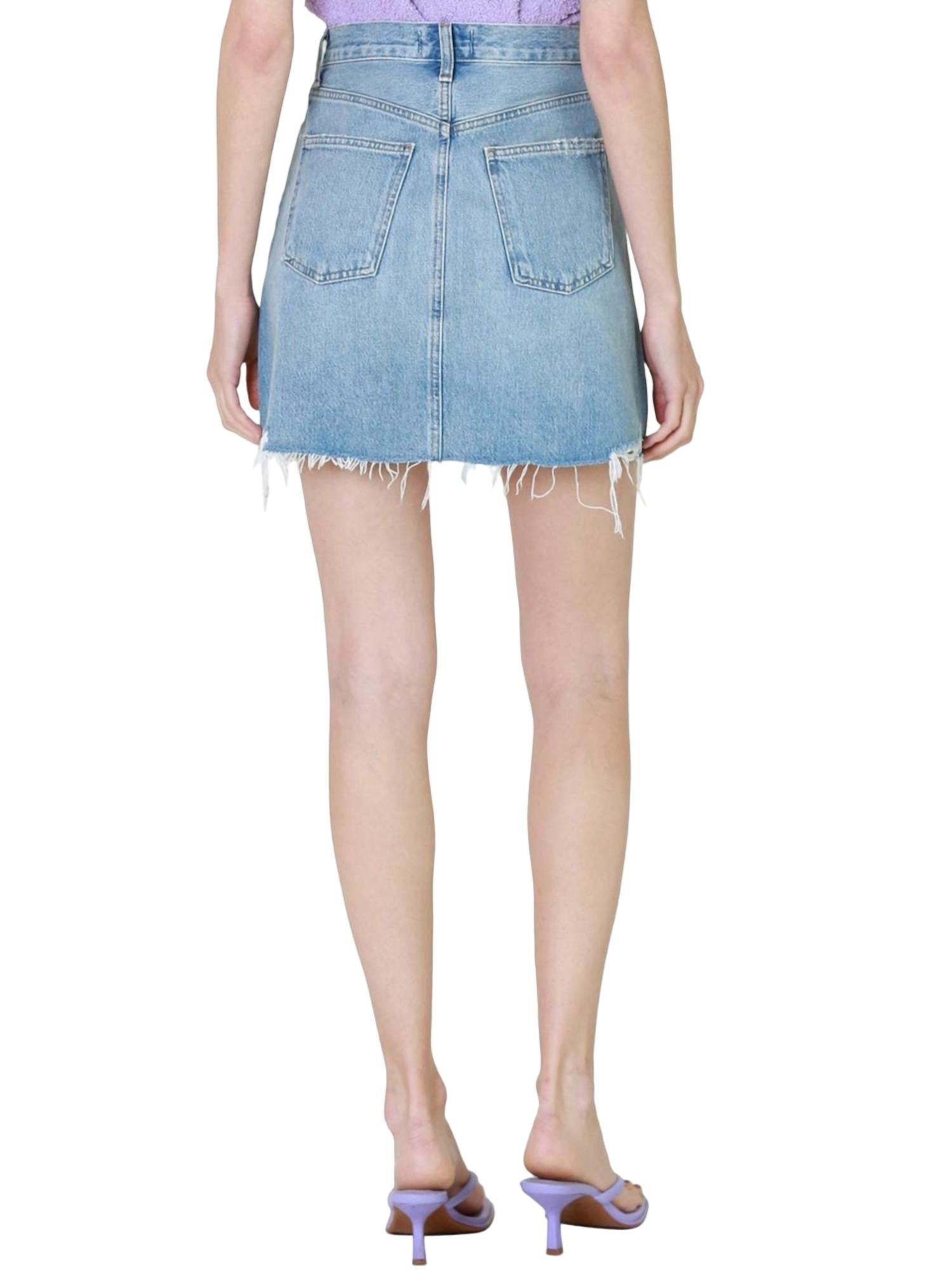 Show just the right amount of leg in this fit flattering mini. Features a criss-cross button front detail and raw hem. Fits true to size. 100% Organic Cotton. Made In USA.