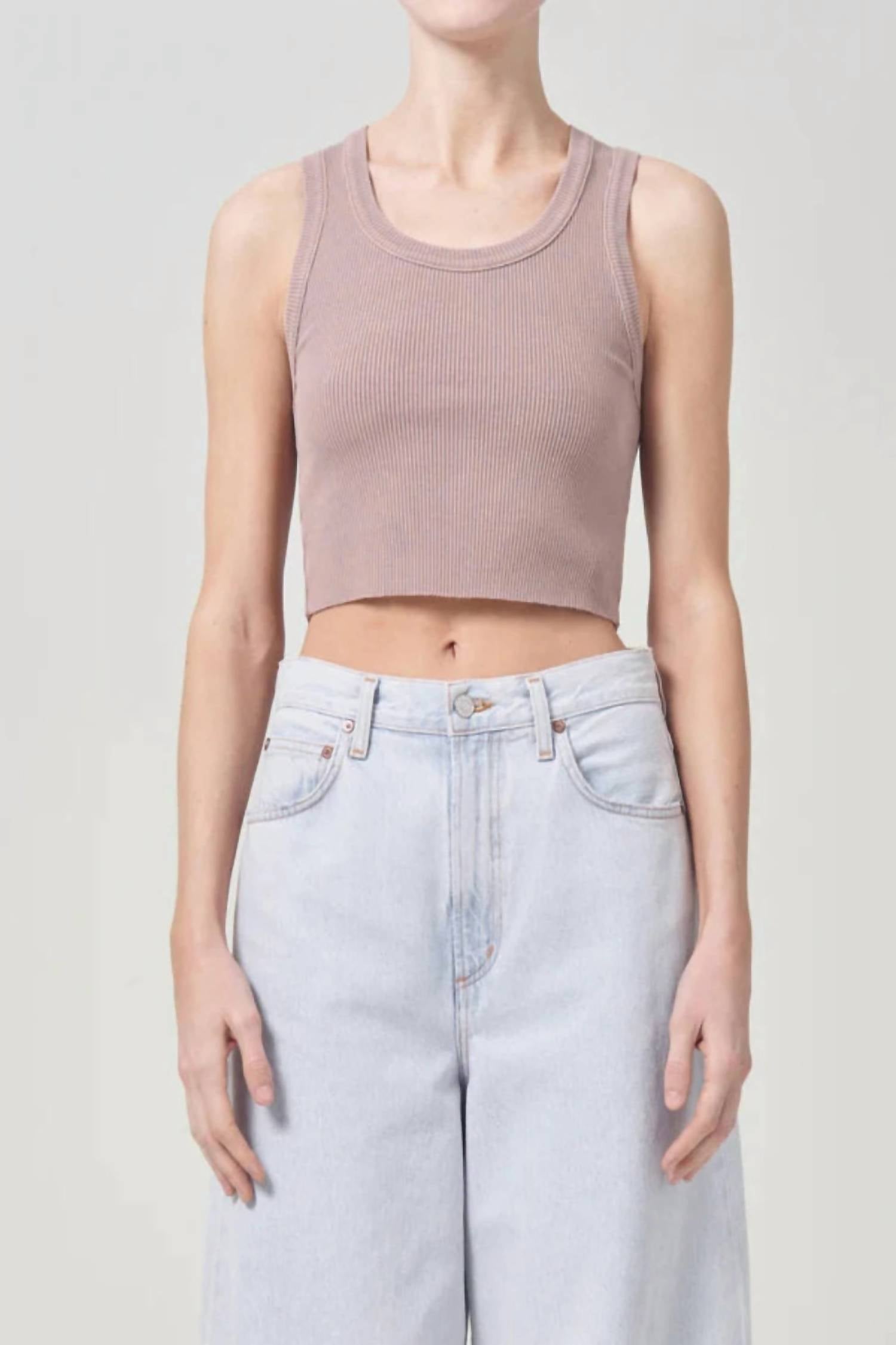 Show a little skin in this cute and casual crop top. Elevate your spring wardrobe with the Cropped Poppy Tank Top by AGOLDE, crafted in a vibrant Spider Lilly shade. This sleeveless, crewneck tank is designed for true-to-size wear, featuring 49% Organic Cotton, 49% Tencel Lyocell, and 2% Spandex for a comfortable fit. The pull-on closure and minimalist design make it ideal for travel and activewear. Care: Machine wash, tumble dry.