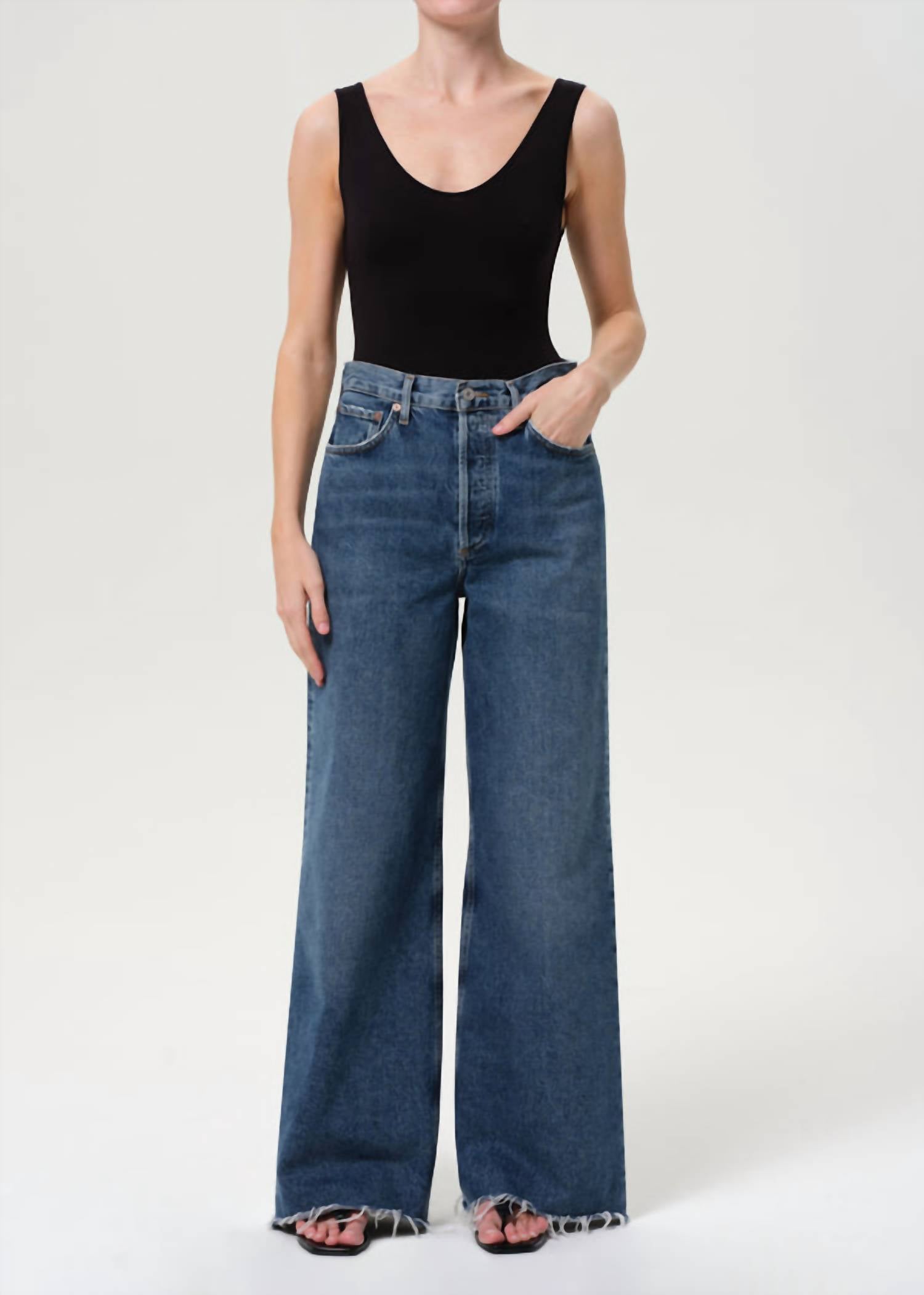 Pair these wide leg jeans with mules, slides or your favorite strappy sandals. Elevate your style with the AGOLDE Dame High Rise Wide Leg Cut Hem Jean in the chic 'Control' color. Crafted from 100% regenerative cotton, this medium indigo denim features a high-rise fit with a relaxed, wide-leg style, enhanced by a raw hem for a modern touch. Closure: Button fly. Care: Machine wash cold inside out with like colors, tumble dry low. Made in the USA with imported materials, these jeans boast dimensions of a 12.5" rise, 32.5" inseam, and 25" leg opening, designed for an effortlessly chic holiday party ensemble. Model is 5'10" and wears a size 27.
