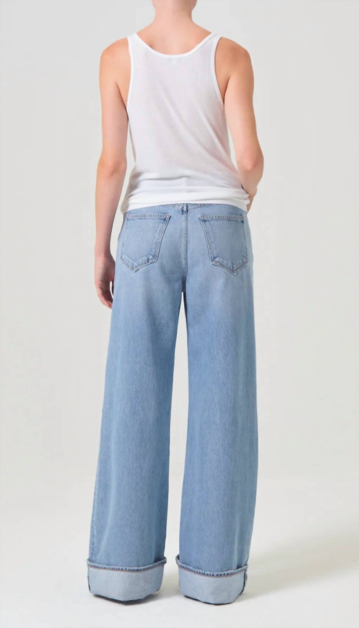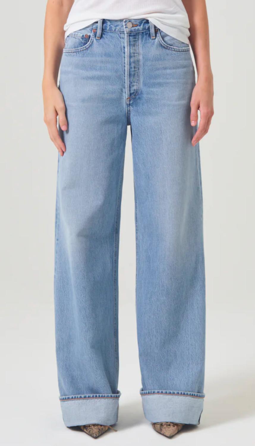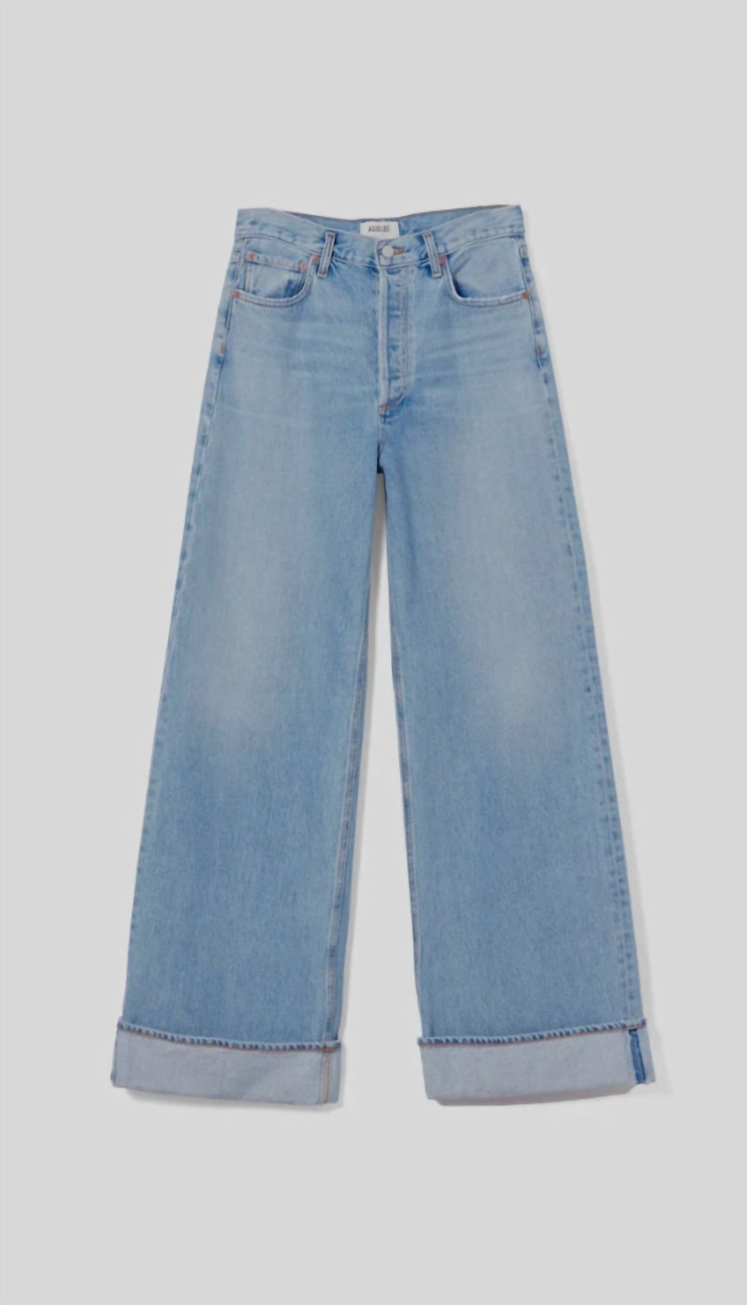 A flattering silhouette that's suprisingly versatile. Rediscover timeless style with the Dame High Rise Wide Leg Jeans by AGOLDE, perfect for a chic fall look. These jeans feature a waist-accentuating high rise with a relaxed wide leg, finished with an untacked cuff in a light wash showdown color. Material: 100% cotton with a heavy-weight, zero-stretch feel that softens over time. Closure: Button closure, Inseam: 32.5". Care: Machine wash. These jeans are ideal for embodying the 90s fashion trend at your next concert outing.