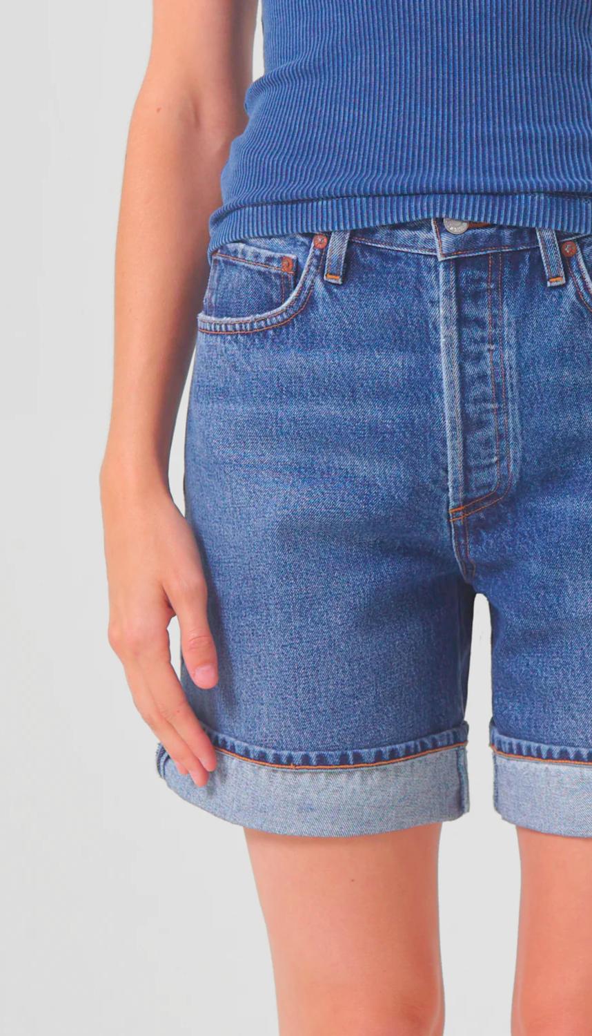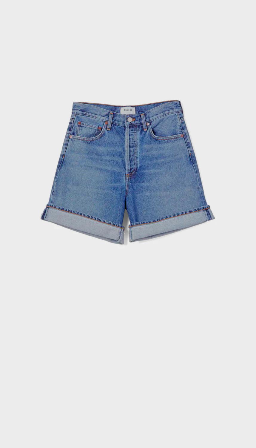 Discover the ultimate warm-weather essential with these stylish women's Bermuda shorts, skillfully crafted to provide a harmonious fusion of fashion and function. Introducing the AGOLDE Dame Short, crafted in a vintage-inspired color called Control. This bermuda short for women features a high rise with a button fly closure and inseam of 6 inches, offering a wide leg opening measuring 25 1/2 inches. Made from 100% regenerative cotton, these shorts provide a zero-stretch, rigid feel that becomes softer with each wash. Care is easy with machine wash cold instructions and tumble dry low, perfect for 90s fashion enthusiasts ready for summer vacations or 4th of July celebrations. Model is 5'10" and wearing a size 27.