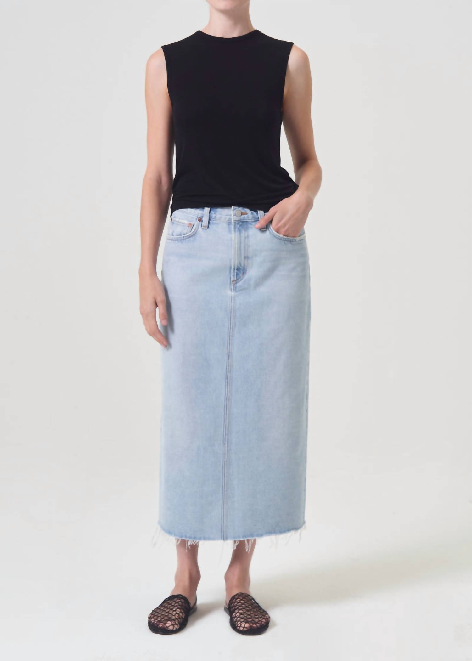 Who doesn't love a good maxi skirt? Introducing the Della Skirt by AGOLDE, an adaptable maxi skirt perfect for any season. Crafted from 100% cotton, this ankle-grazing skirt features a solid pattern with dimensions of 32" waist, 43.5" length, and a 32.75" sweep. The fitted design is complemented by a practical zipper fly closure, making it easy to pair with boots or sandals. Care is simple with machine wash cold and tumble dry low instructions, ensuring this versatile piece remains a staple in your wardrobe. Model is 5'10" and wearing a size 27.