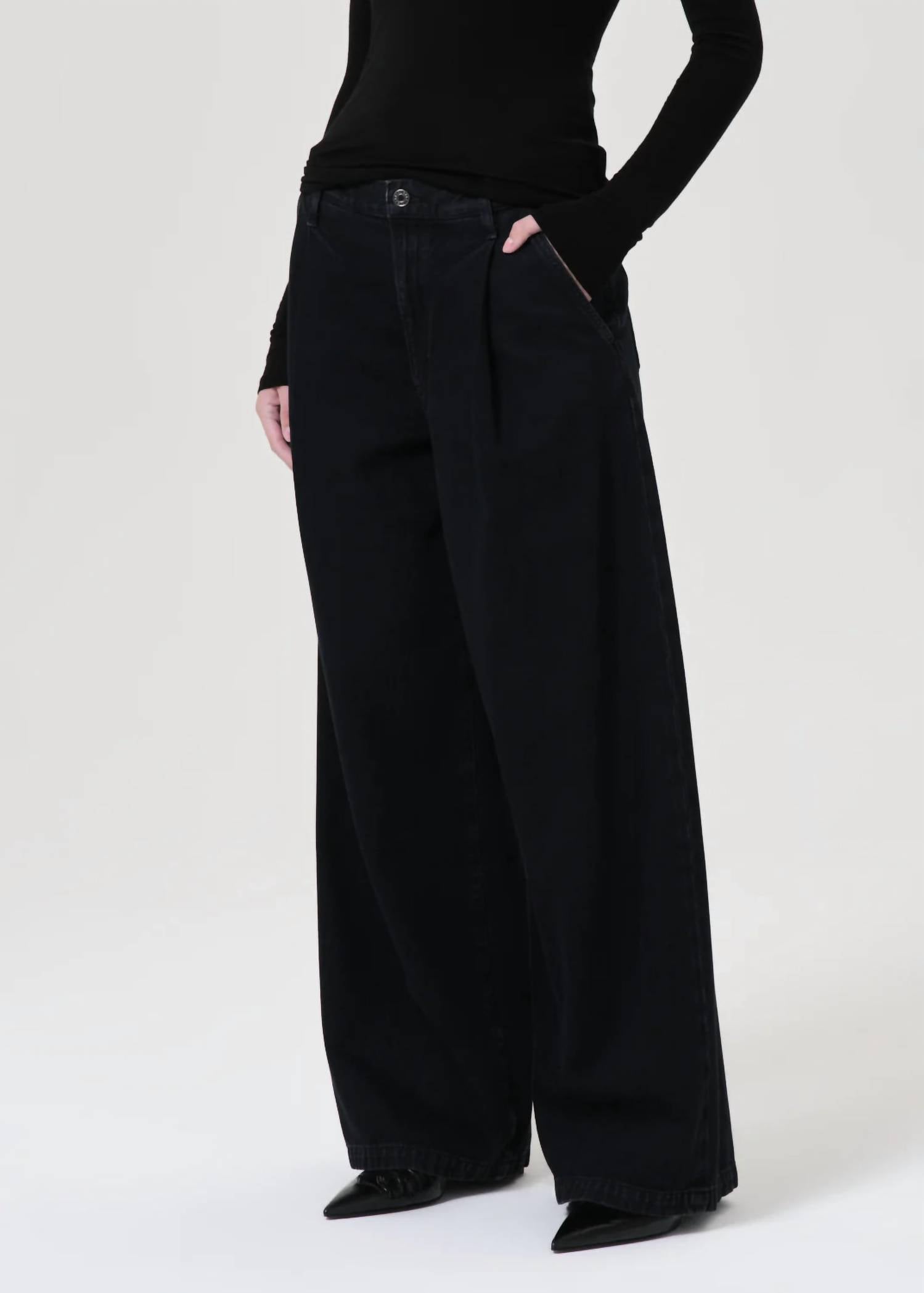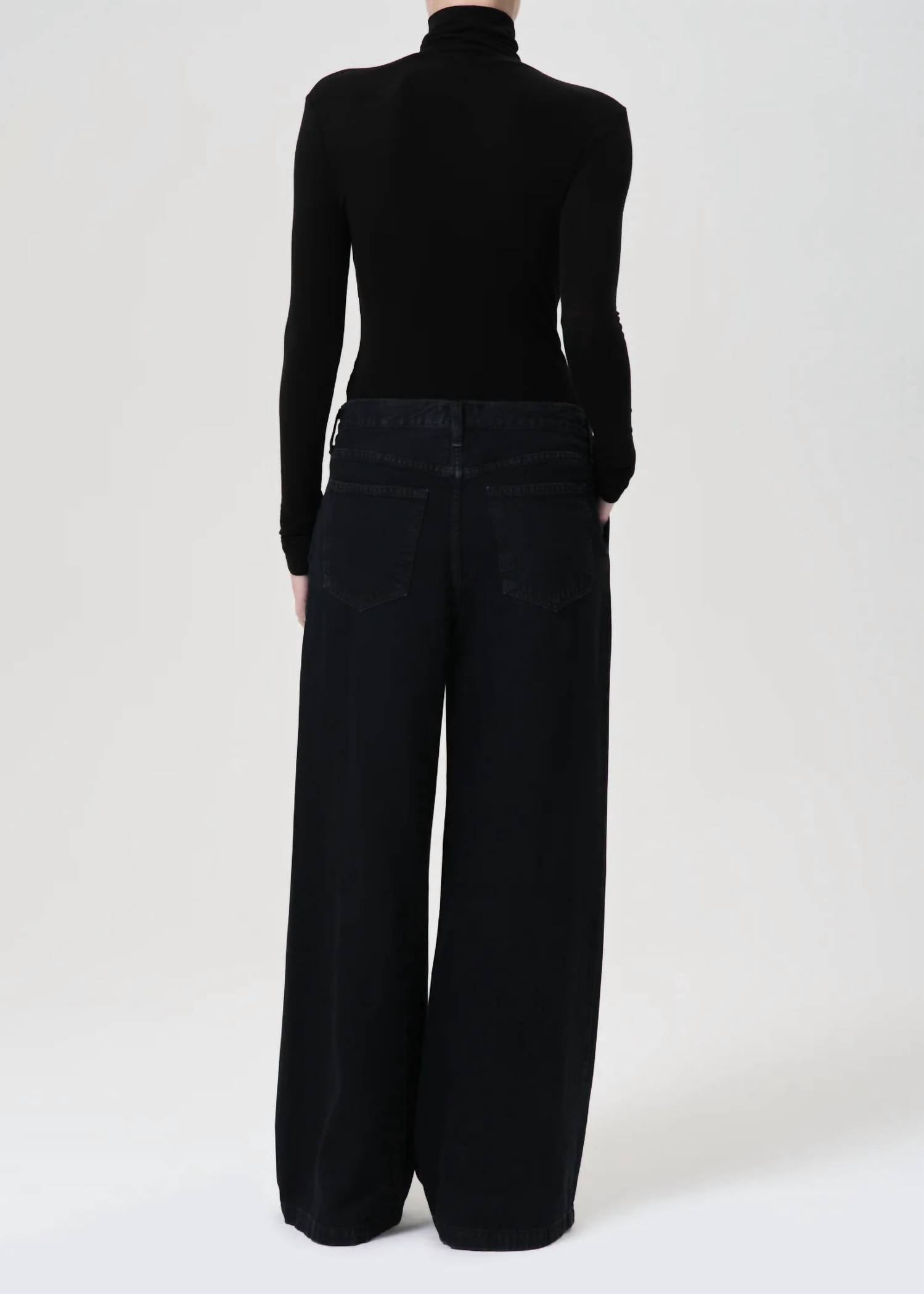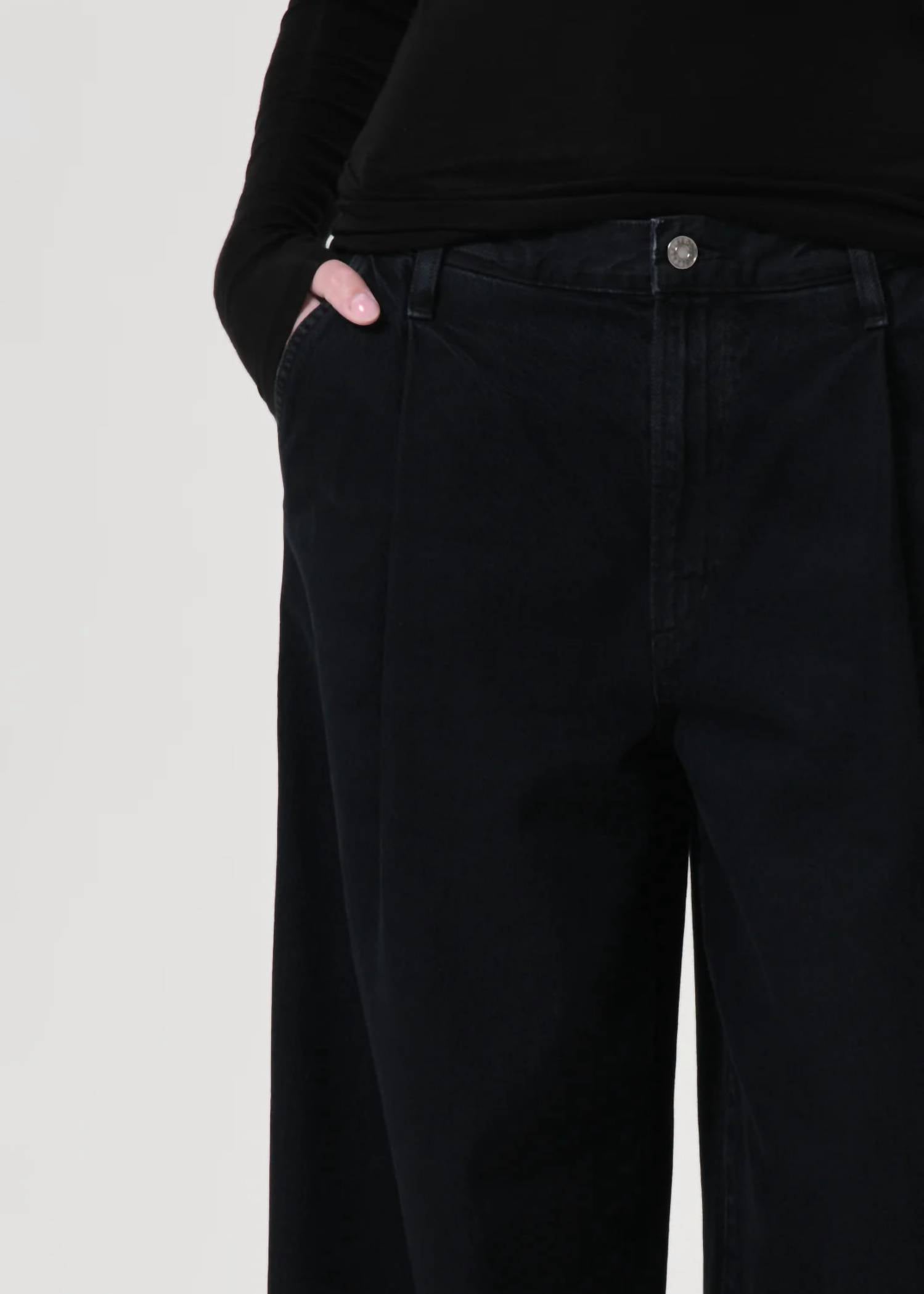 These wide-leg pants, crafted from 100% regenerative cotton, promise a perfect fit with their 12 1/2" rise and 32" inseam. Originating from the US, they feature a zipper fly closure and promise to grow softer over time. Available in a saturated clean black, these trousers require a simple machine wash, making effortless style truly sustainable.