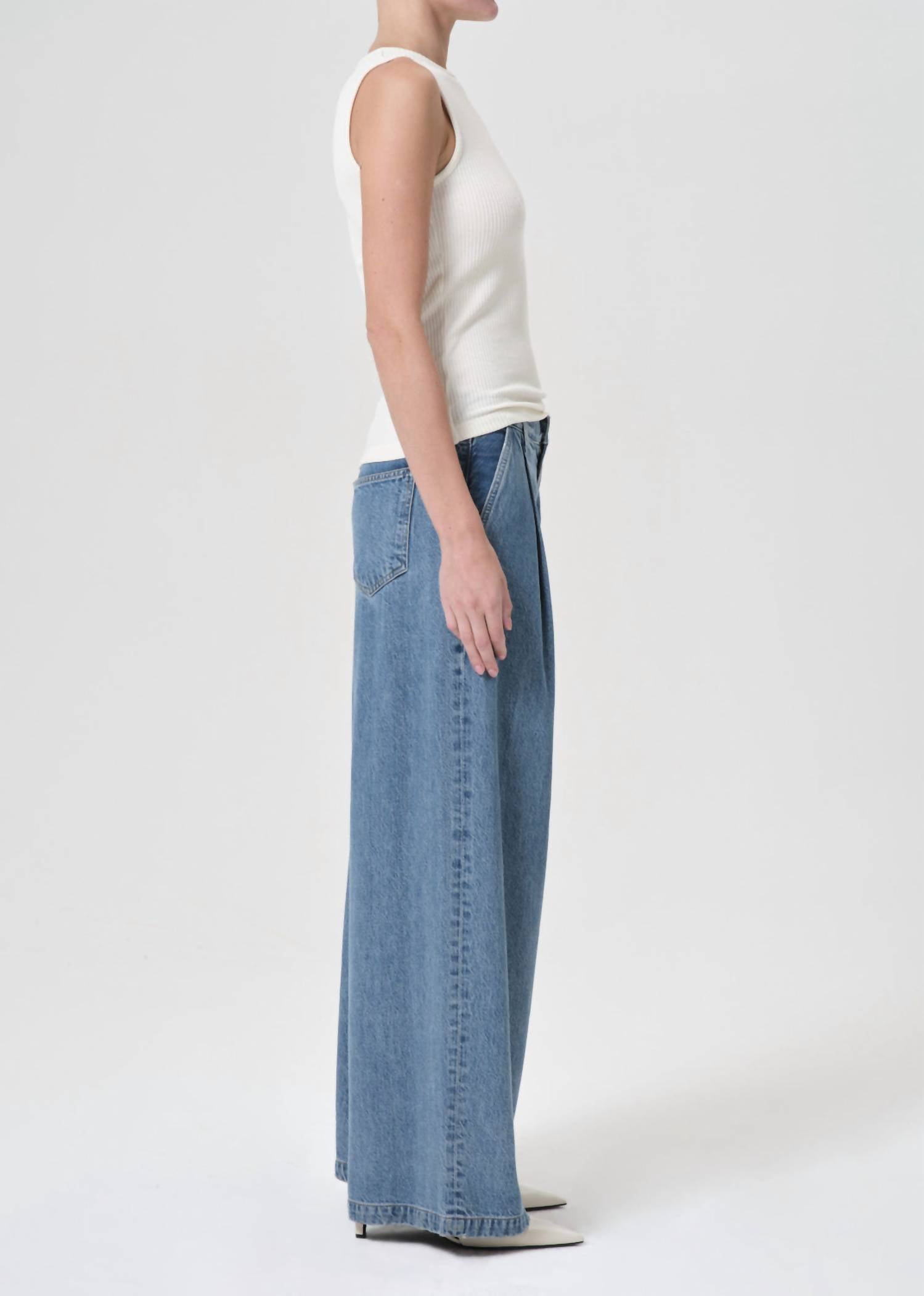 Introducing the AGOLDE Ellis Trouser Pants, expertly crafted with a blend of 70% Lyocell and 30% Pre-Consumer Recycled Cotton for a mid-weight feel and vintage-inspired denim look in a solid medium indigo color. These stylish wide-leg trousers are designed with a relaxed fit, featuring pleat details at the waist, a 12 1/2" rise, and a 32" inseam.