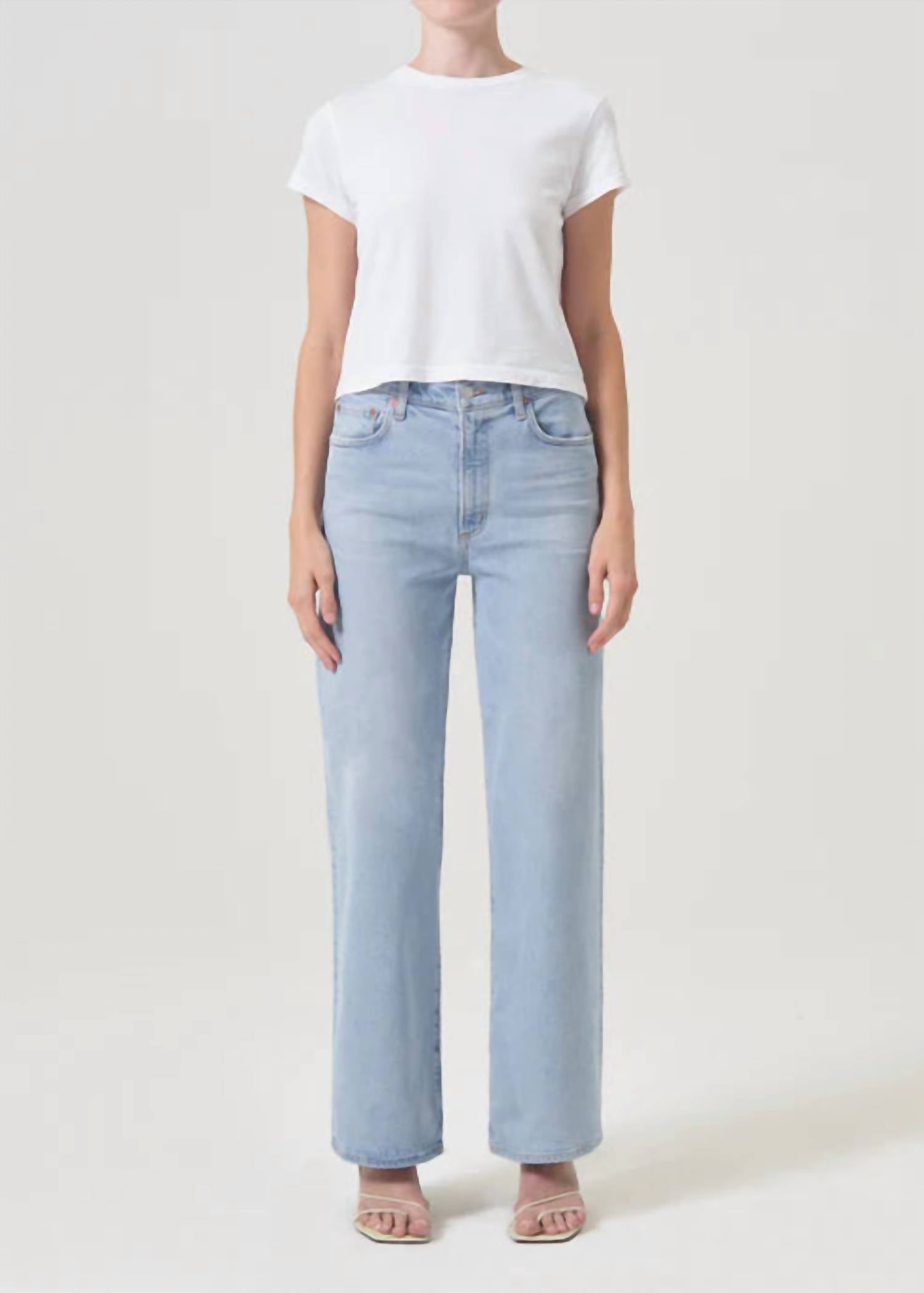 This classic straight leg jean has a perfect fit and goes with just about everything. Discover the AGOLDE Harper Jeans in Trouble, a must-have for your denim collection. With a relaxed fit and mid-rise, these jeans boast a straight leg with a subtle wide silhouette, delivering both comfort and style. Made from an organic cotton blend, they ensure a soft feel while promising lasting durability. Closure features a button closure, and care is straightforward with machine wash and tumble dry. Designed in a clean light indigo shade with finished hems, these jeans align with preppy trends and are perfect for a Thanksgiving vacation. Available in sizes 25 to 30.