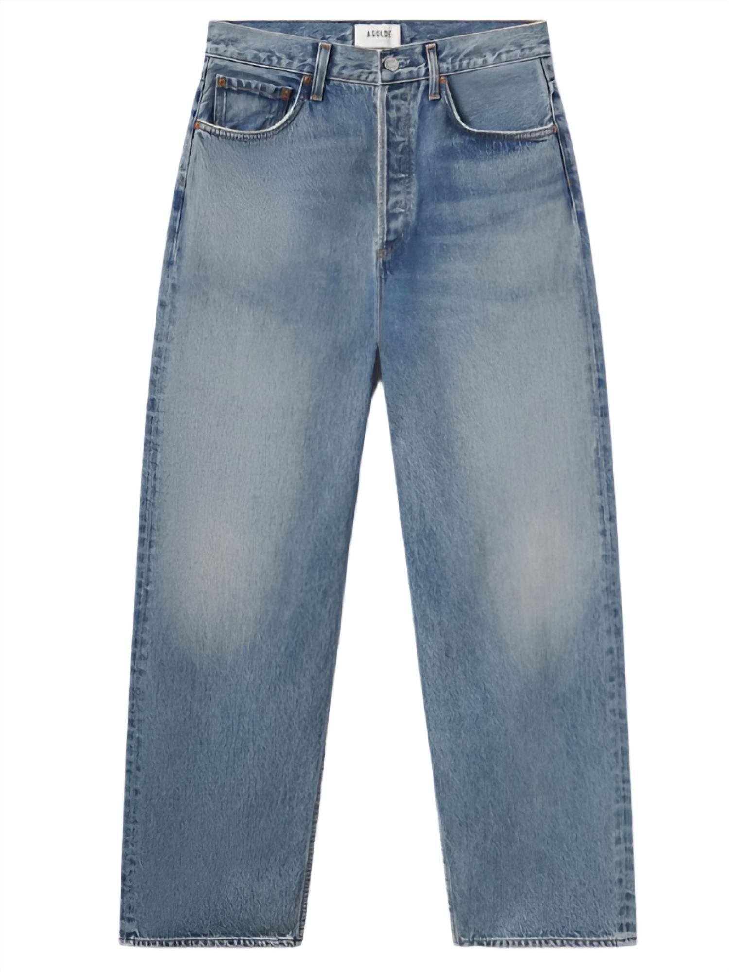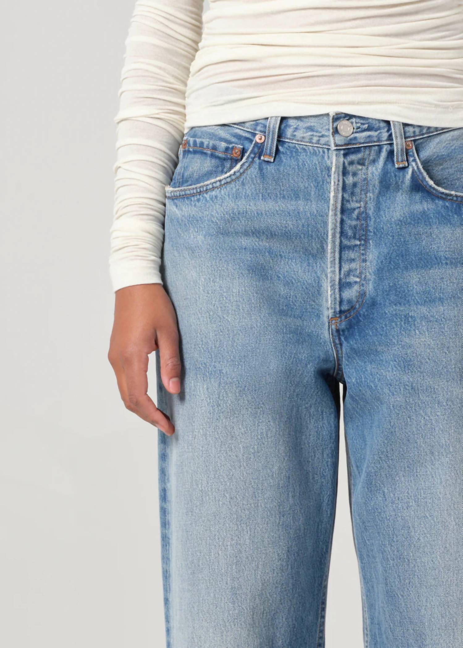 Discover the Henson Jean by AGOLDE, a perfect blend of style and sustainability made for the modern woman. Featuring a mid-rise waist and crafted from a sustainable mix of 67% regenerative cotton, 22% lyocell, and 11% post-consumer recycled cotton, this non-stretch denim provides both comfort and eco-friendliness. With a length reaching 31 inches in the inseam, these jeans showcase a medium blue vintage wash that offers a worn-in look. Closure: Button fly. Designed in the vibrant "Intuition" color, these imported, straight-leg jeans are 18 inches in leg opening, ideal for pairing with all outfits.