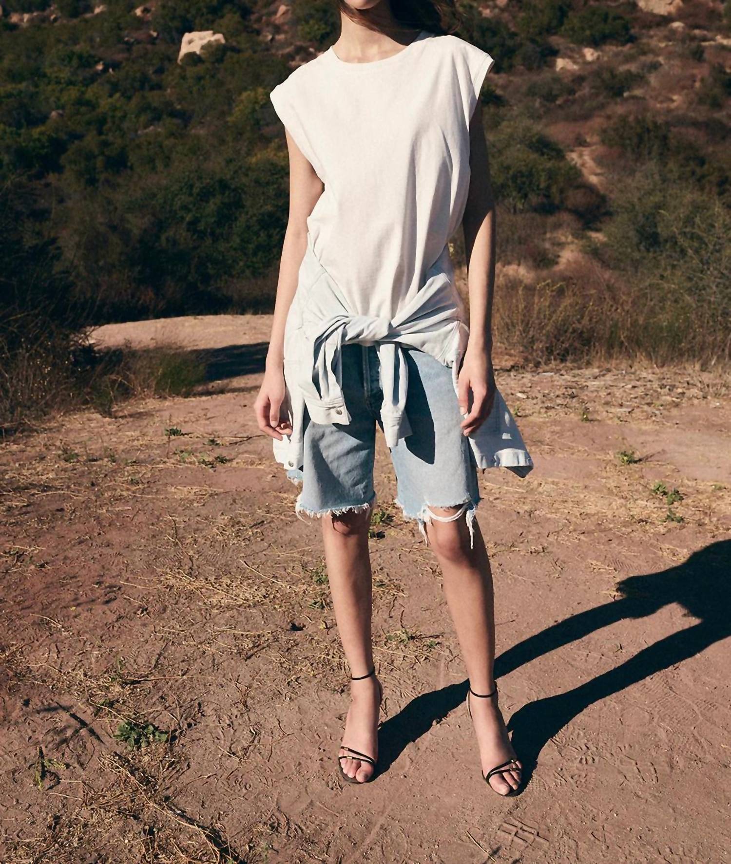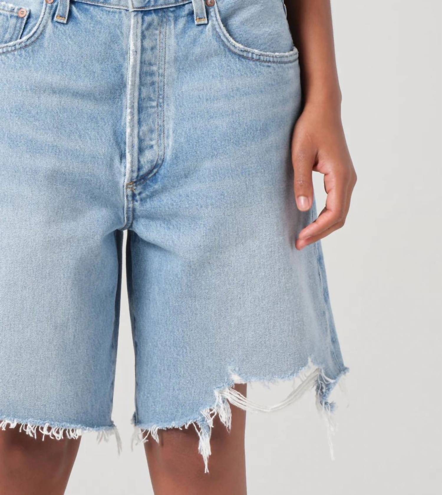 You can never have too many jean shorts and these will be your new favorites. Embrace casual cool with the Indra Jean Short by AGOLDE, crafted for a perfect blend of comfort and style. These women's shorts feature a solid pattern with a hip-slung fit and a square top block, designed for relaxed, effortless style. Made from regenerative cotton, they showcase vintage marbled light indigo denim with unique fading, whiskering, and a raw hem. Closure: Button closure. Perfect for spring vacations, these shorts are easy to pair with a simple white tank or an oversized button-down for versatile wear.