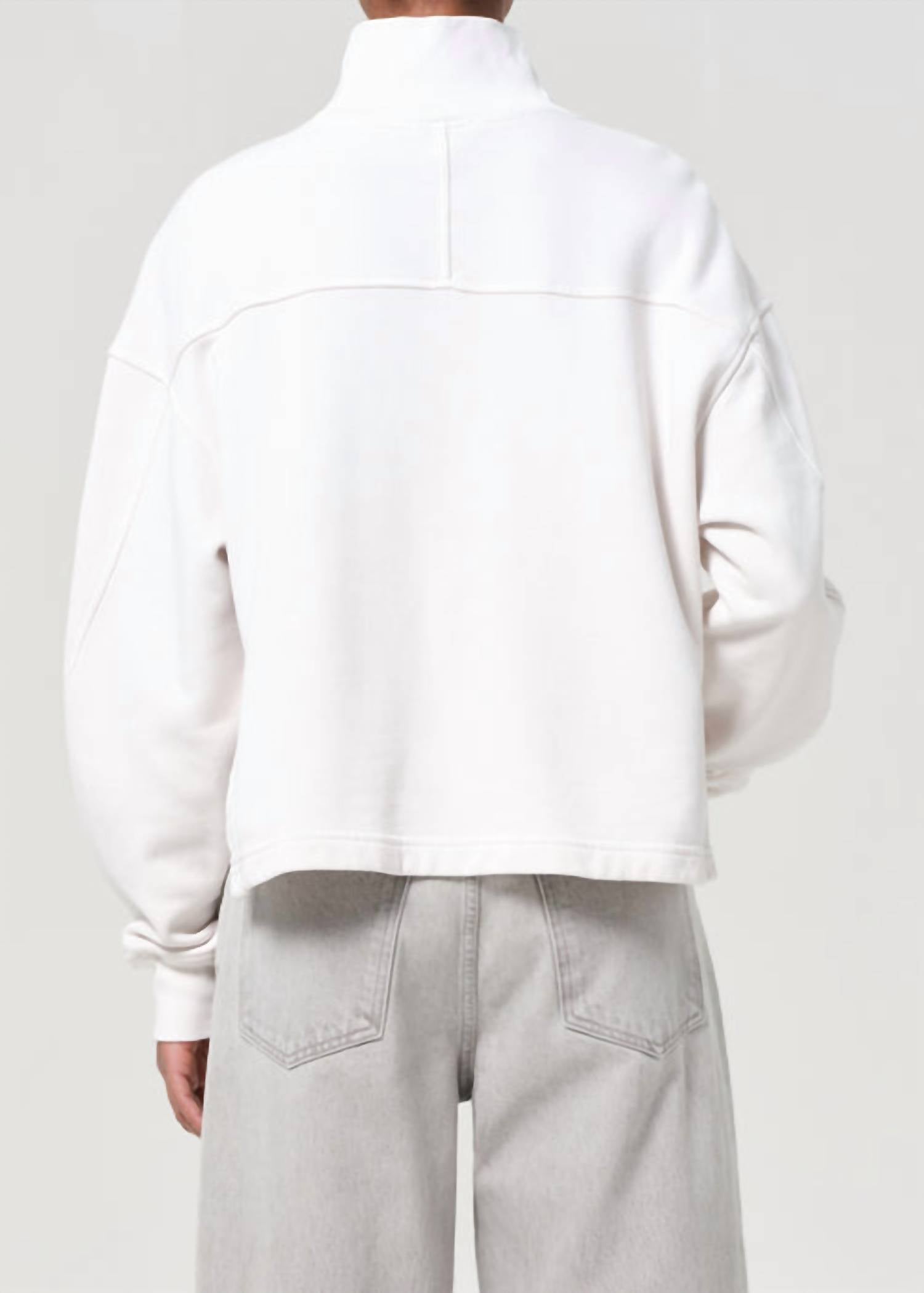 Whether you're running around town or lounging at home, this sweatshirt works for both. Discover the Isra Sweatshirt by AGOLDE, a sophisticated yet relaxed addition to your wardrobe. Designed with long sleeves and a structured mock neck, this cropped sweatshirt offers a voluminous silhouette in a classic solid Wired color. Crafted from 100% Supima Cotton, it's made in the USA with imported materials, ensuring both luxury and comfort. Closure: Pull on. Care: Machine wash cold. Model is 5'10" and wears a size Small.