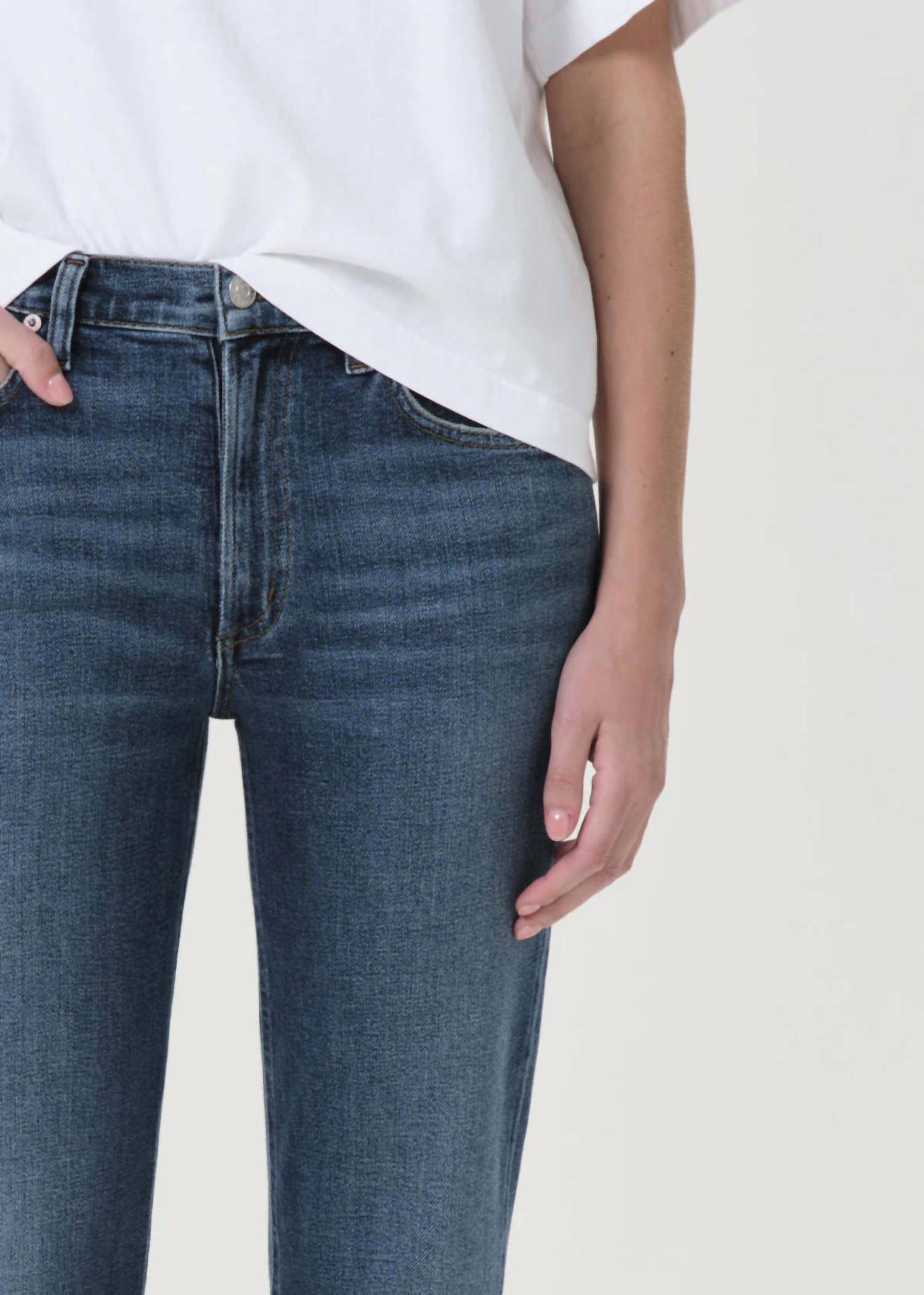 These must-have jeans are fit to perfection. Discover the Kye Mid Rise Straight Crop Jeans by AGOLDE, perfect for any casual wardrobe. These jeans boast a mid-rise waist and a slim fit through the hips, with a straight leg that ends above the ankle, achieved through an inseam of 27 inches. Crafted in Turkey from weightless stretch denim, they promise day-long comfort, while the solid dark wash offers a timeless appeal. Composition: 96% Regenerative Cotton, 3% Elastomultiester, 1% Elastane. Closure: Zip Fly. Care: Machine wash, tumble dry.