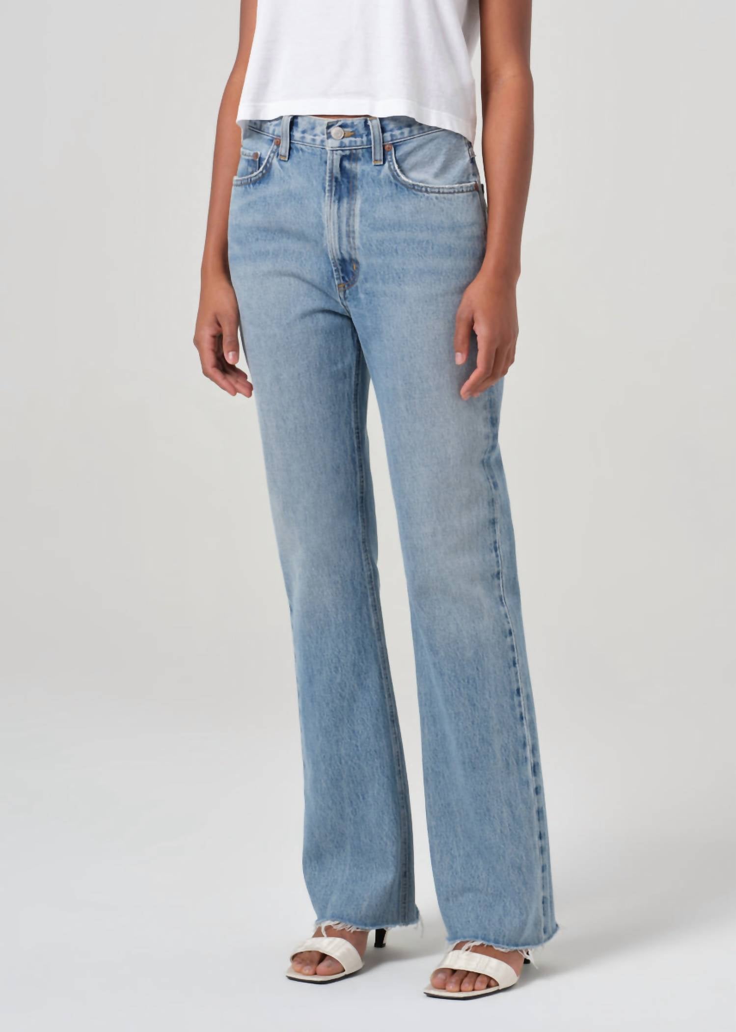 Just as cute as they are comfortable. Discover the Leena Mid Rise Baby Flare Jean by AGOLDE, a chic blend of modern style with a vintage twist, in a Stage hue. Crafted in 100% regenerative cotton, this jean features a relaxed fit with a high-rise waist and flared leg. Additional details include traditional five-pocket styling and a raw cut hem. Closure: Button closure. Care: Machine wash and tumble dry.