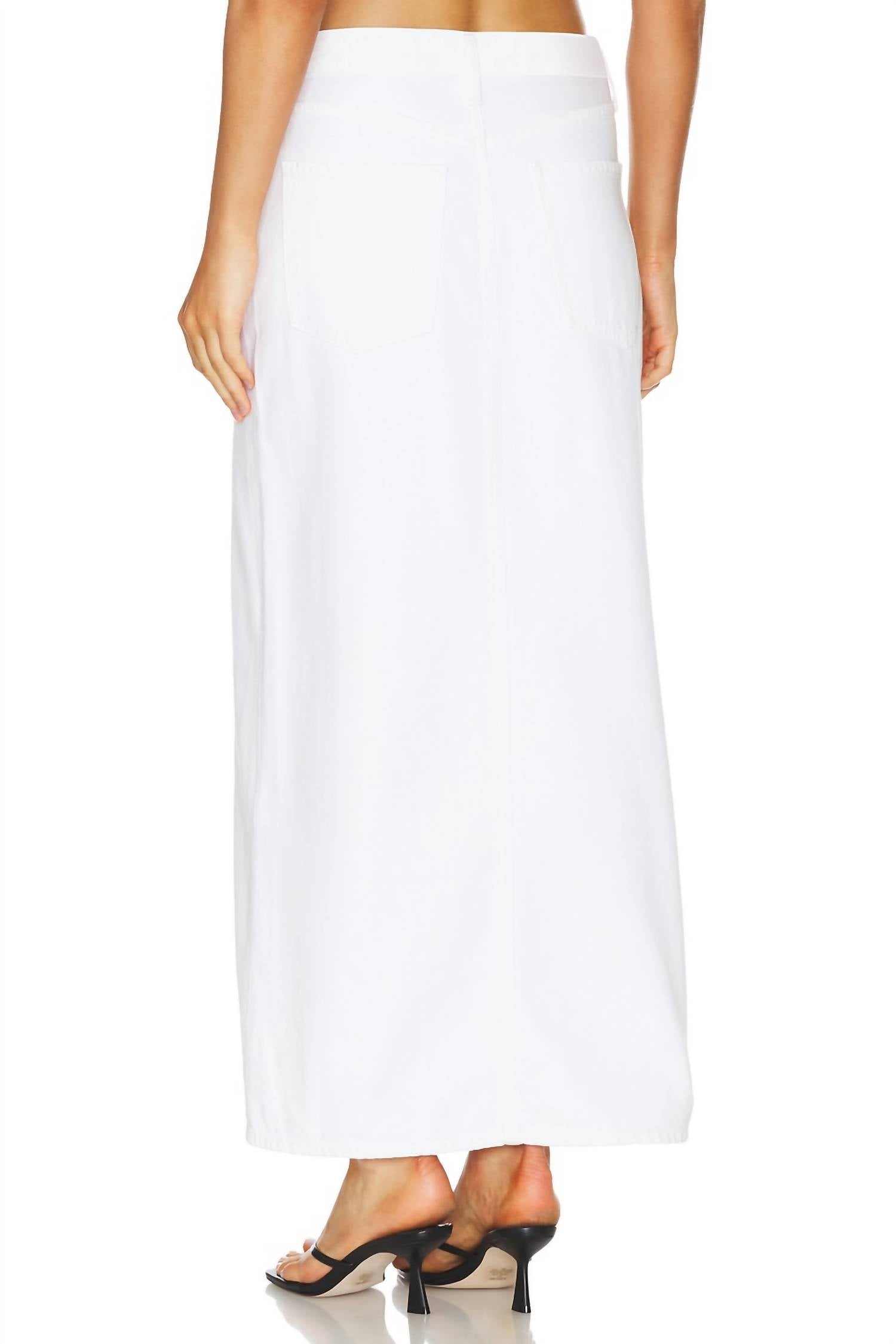 Tuck in your favorite tee for a more casual yet feminine look.100% cotton. Made in USA. Machine wash. Unlined. Zip fly with button closure. 5 pocket styling. Skirt measures approx 97 cm in length.