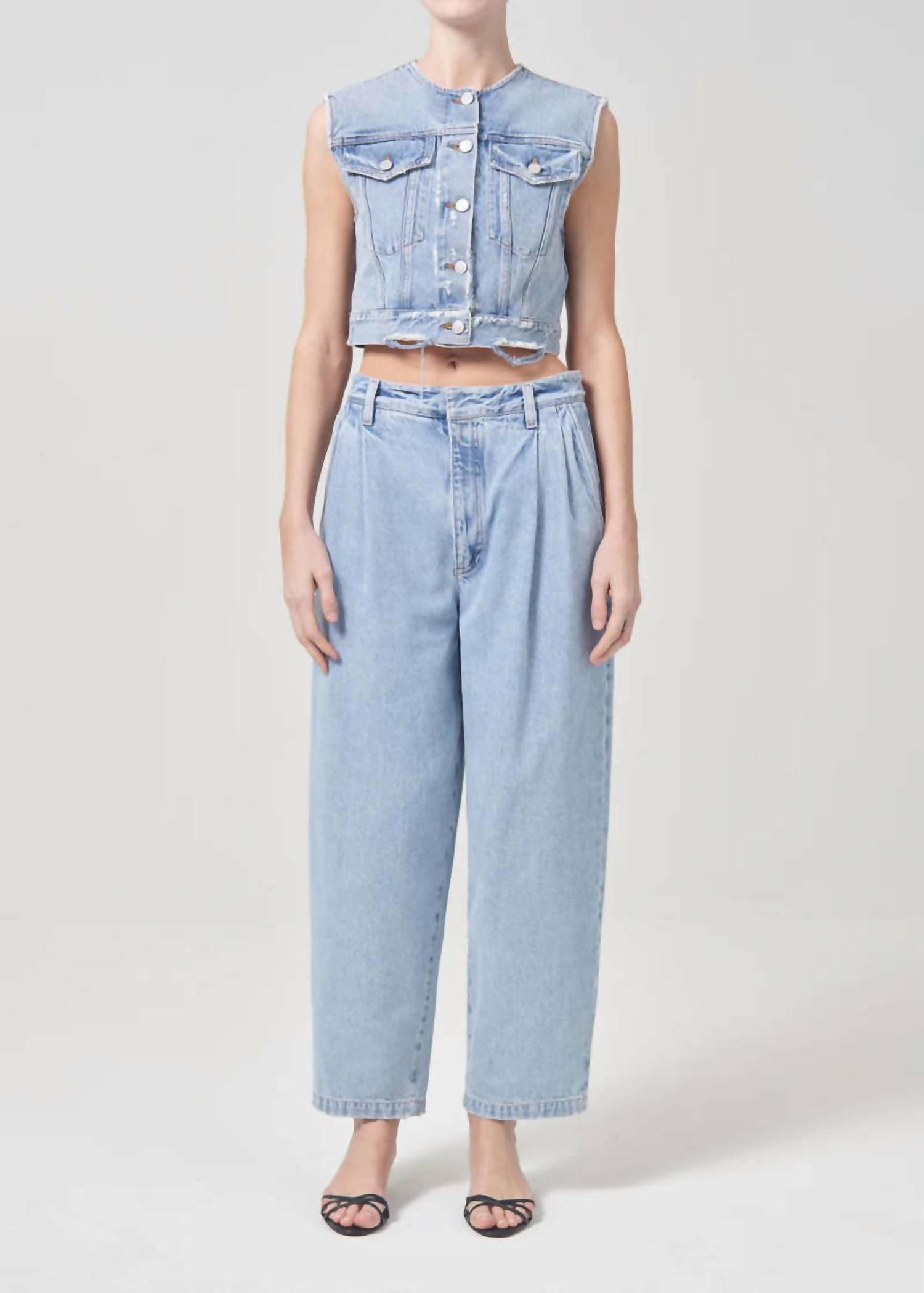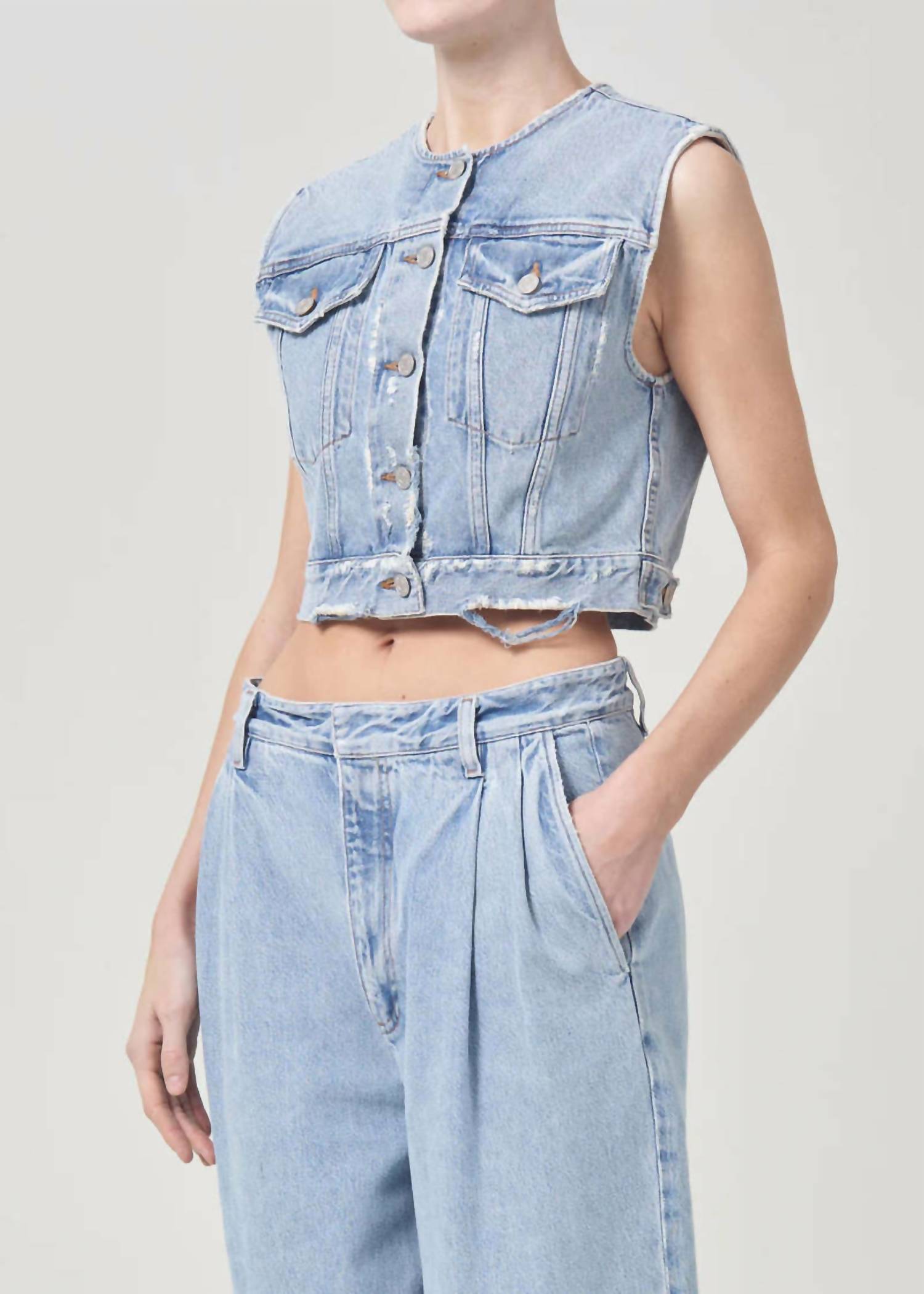 Throw this vest over an all black outfit for a perfectly polished look. Introducing the Leo Cropped Vest by AGOLDE, a chic summer essential for your wardrobe. This sleeveless vest is crafted in a blend of 80% organic cotton and 20% recycled cotton, providing a cool and comfortable fit. Made in Turkey, the vest features a solid 'Fray' color with classic denim jacket details and a button closure. Easy to care for with machine wash instructions, this piece is both stylish and sustainable.