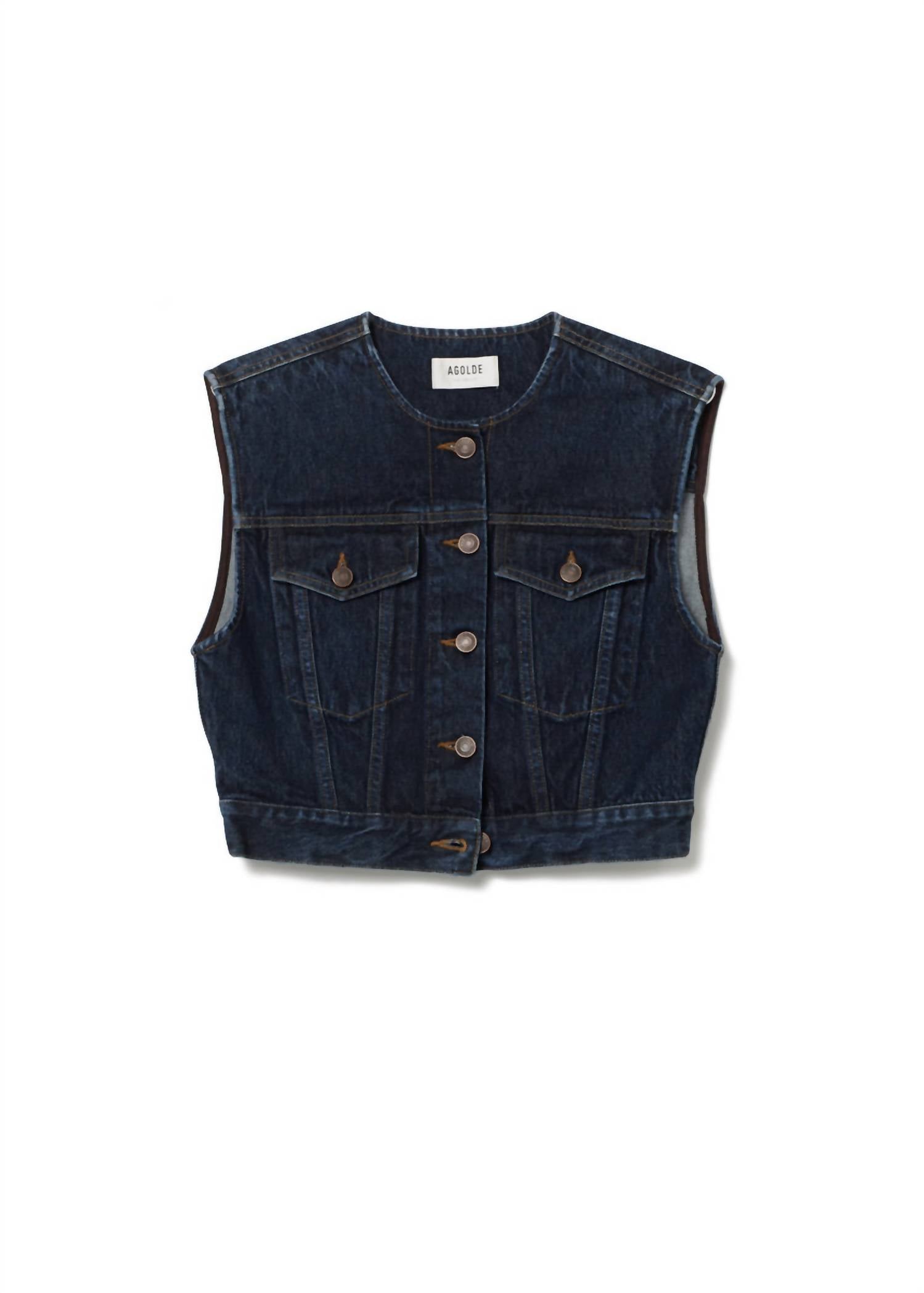 Throw this vest over an all black outfit for a perfectly polished look. This structured, collarless denim vest has a close, cropped fit. It features classic denim jacket details such as a button-front closure and flap chest pockets. Made from 100% regenerative cotton. Machine wash cold. Made in Turkey.
