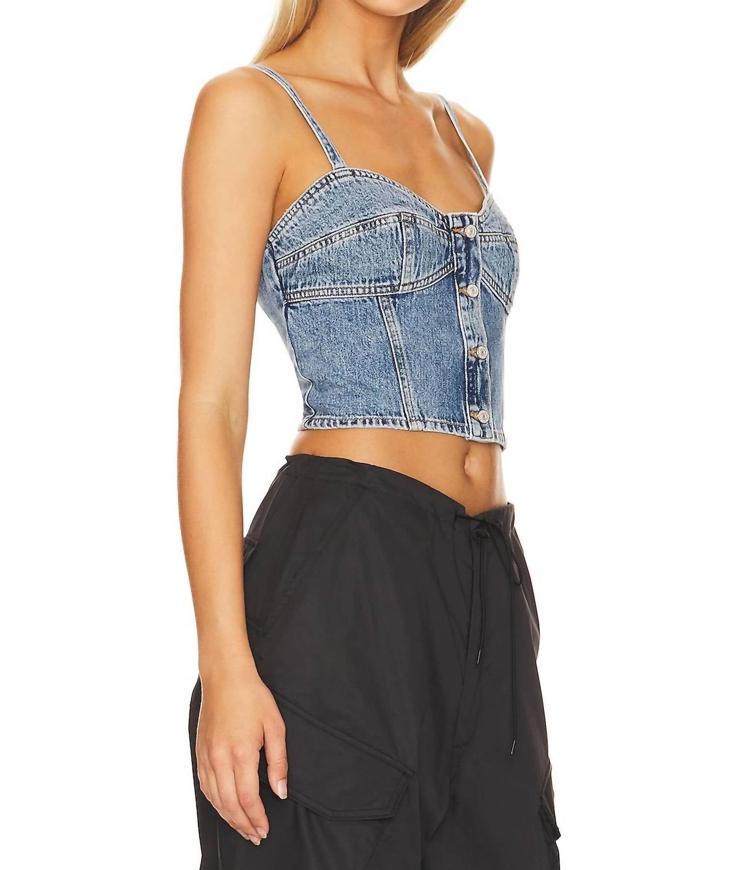 Pair this crop top with your favorite high-waisted jeans or maxi skirt.Front button closure. Adjustable shoulder straps. Structured denim fabric. Model is 5'10" and is wearing a size S. Made in USA. Fabric: 100% Cotton. Machine wash.