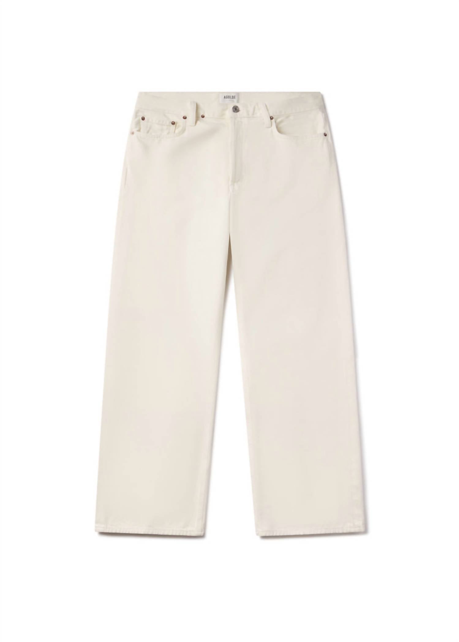 Pair these straight leg jeans with flats, sandals or even heels! You can't go wrong. The AGOLDE Low Slung Baggy Jeans in Solar encapsulate a laid-back yet sophisticated style with their low-rise and relaxed fit. Made from regenerative cotton, these solid-pattern, pale yellow jeans offer a baggy straight leg silhouette perfect for modern neutral dressing. Originating from the US, they feature a practical button closure and functional pockets. For care, machine wash and tumble dry for easy maintenance, with an inseam of 30.5 inches and a rise of 12.5 inches delivering an effortlessly chic look. 100% Regenerative Cotton.