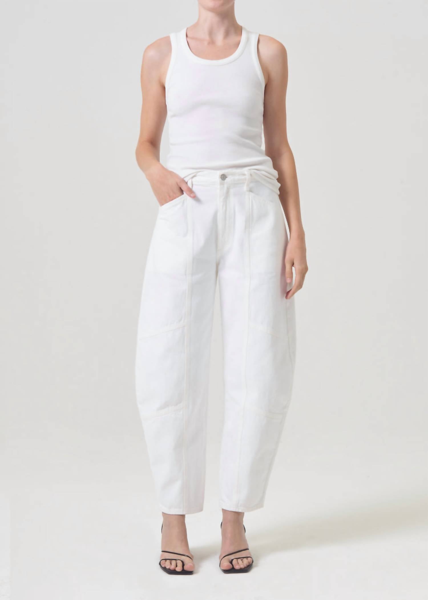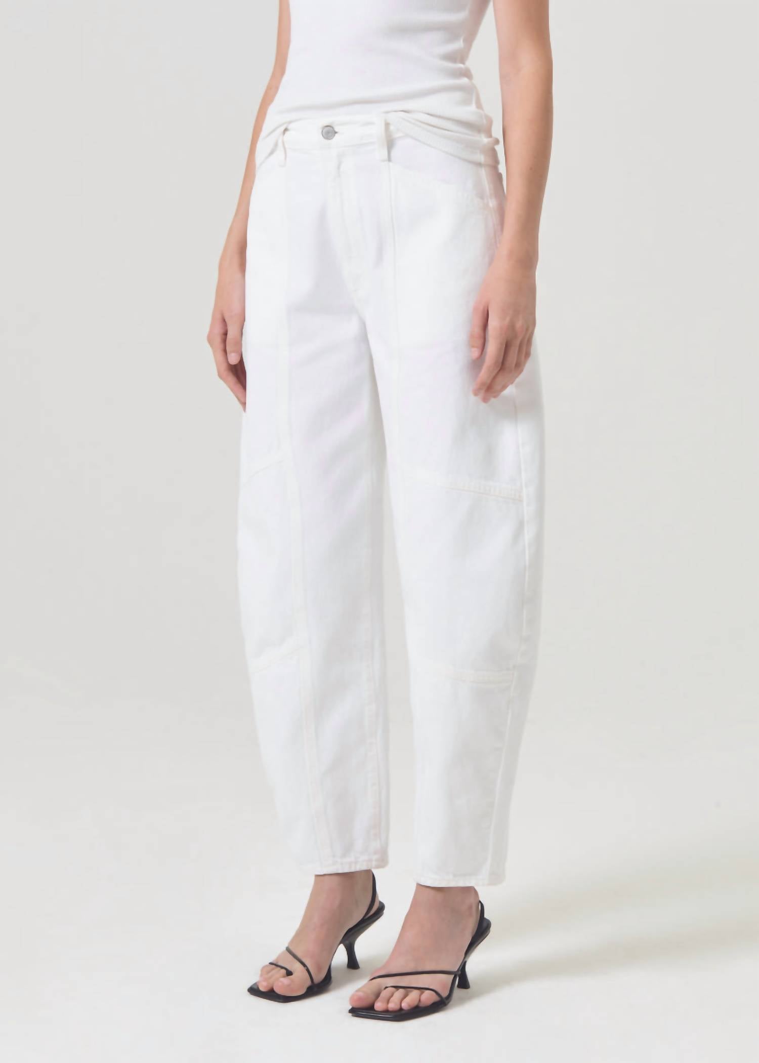 A directional twist on a modern silhouette. The Mara fits high on the waist, relaxed around the hips, and is complemented with paneled topstitching seam detailing - the unique curved outseam takes your denim wardrobe to the next level. Crafted in AGOLDE’s signature Organic Cotton so you can feel good while looking good. This fit is true to size. Looks Like: Clean white finished hems. Feels Like: Zero-stretch, heavyweight cotton that will grow softer with each wear. Closure: Zipper Fly. Rise: 12 1/4". Inseam: 28". Leg Opening: 15" . Model is 5'10" and is wearing a Size 27. Fabric: 100% Regenerative Cotton. Care Instructions: Machine wash cold inside out with like colors. Do not bleach. Tumble dry low. Made in Turkey with imported materials.