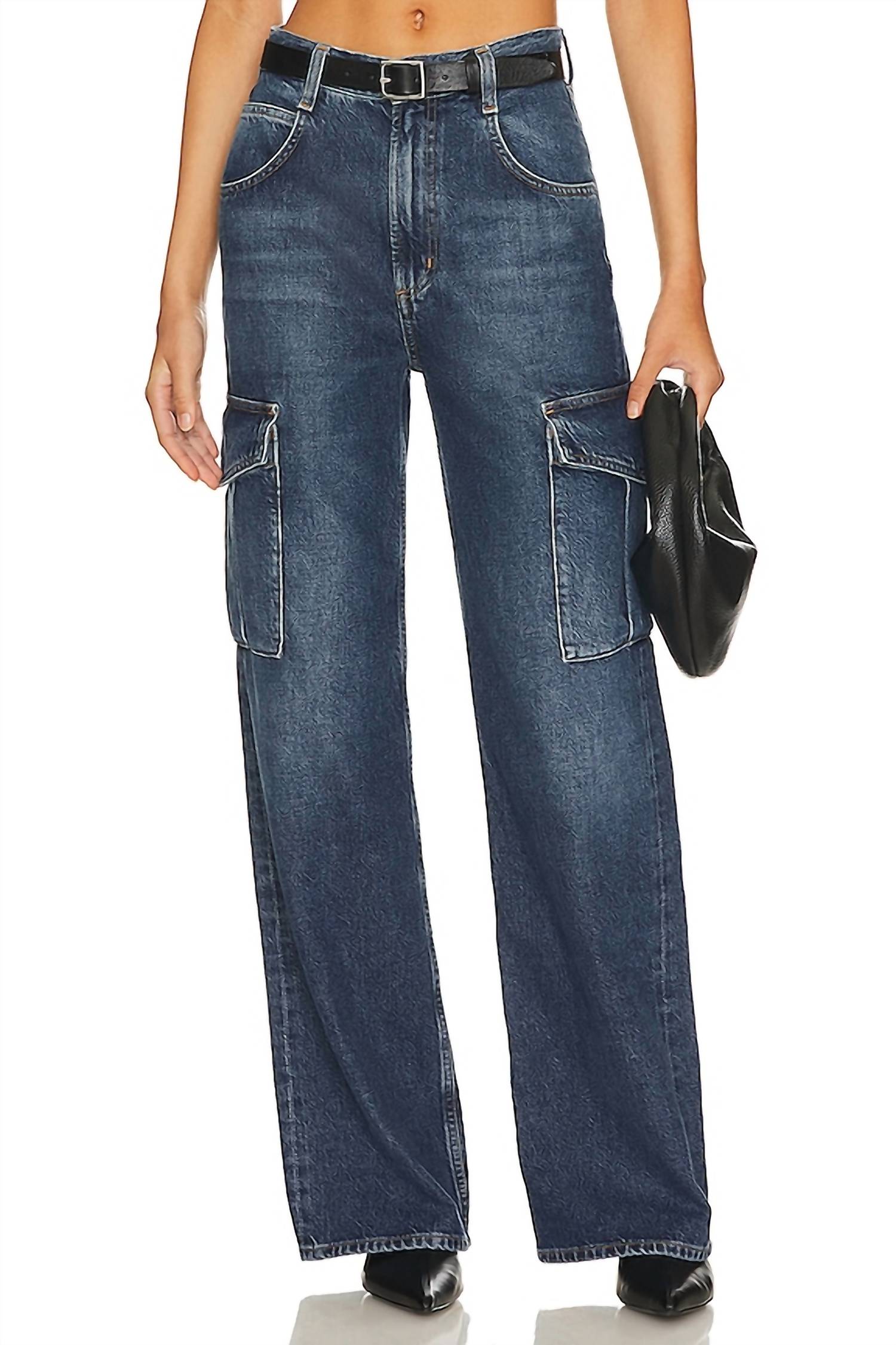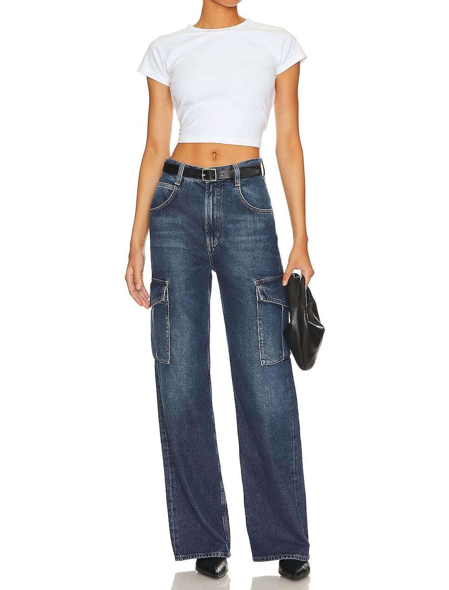 A flattering silhouette that's suprisingly versatile.Crafted from medium wash denim and accented with distressed details, these high-waisted cargo pants offer both function with its 7-pocket design, including two cargo pockets, and fashion flair with its wide leg. 75% regenerative cotton 25% recycled lyocell. Made in Turkey. Machine wash. Zip fly with button closure. 20" at the knee breaks to 21.25" at the leg opening.