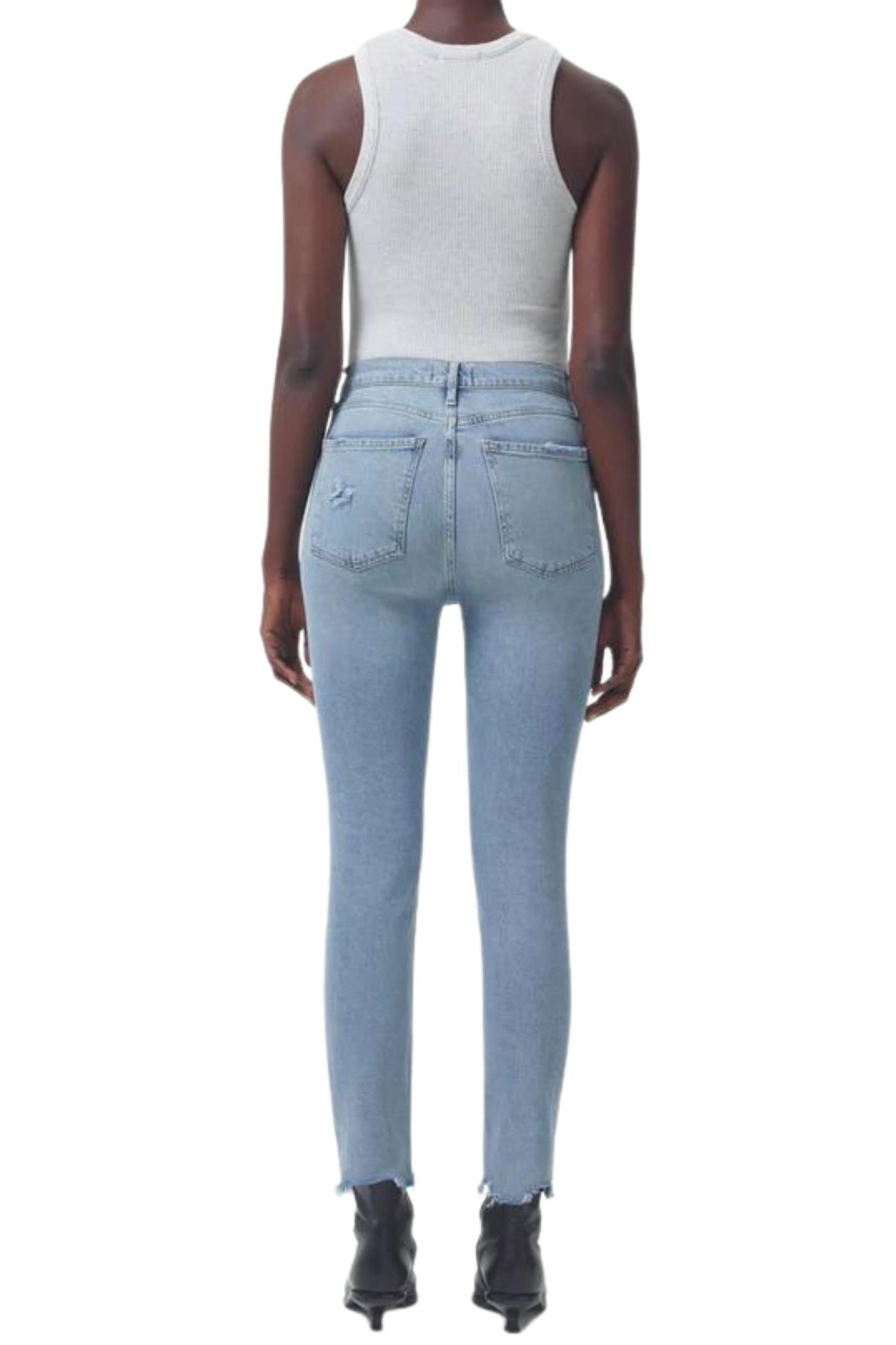 Tuck your favorite tee into these high-waist jeans for a more casual-cool feel. Upgrade your denim collection with the Nico High Rise Slim Fit Jeans in Rooted by AGOLDE, perfect for showcasing a sleek, stylish look. These jeans come in a solid blue hue and feature a high-rise waist with a slim fit and skinny leg style. Crafted from a sustainable cotton blend, composed of 66% lyocell, 32% organic cotton, and 2% recycled elastane, they offer comfort and durability. The design includes a button fly closure, with a rise of 11.25 inches and an inseam of 27 inches, making them a chic fit for any occasion. Care for these jeans is easy with machine wash instructions.