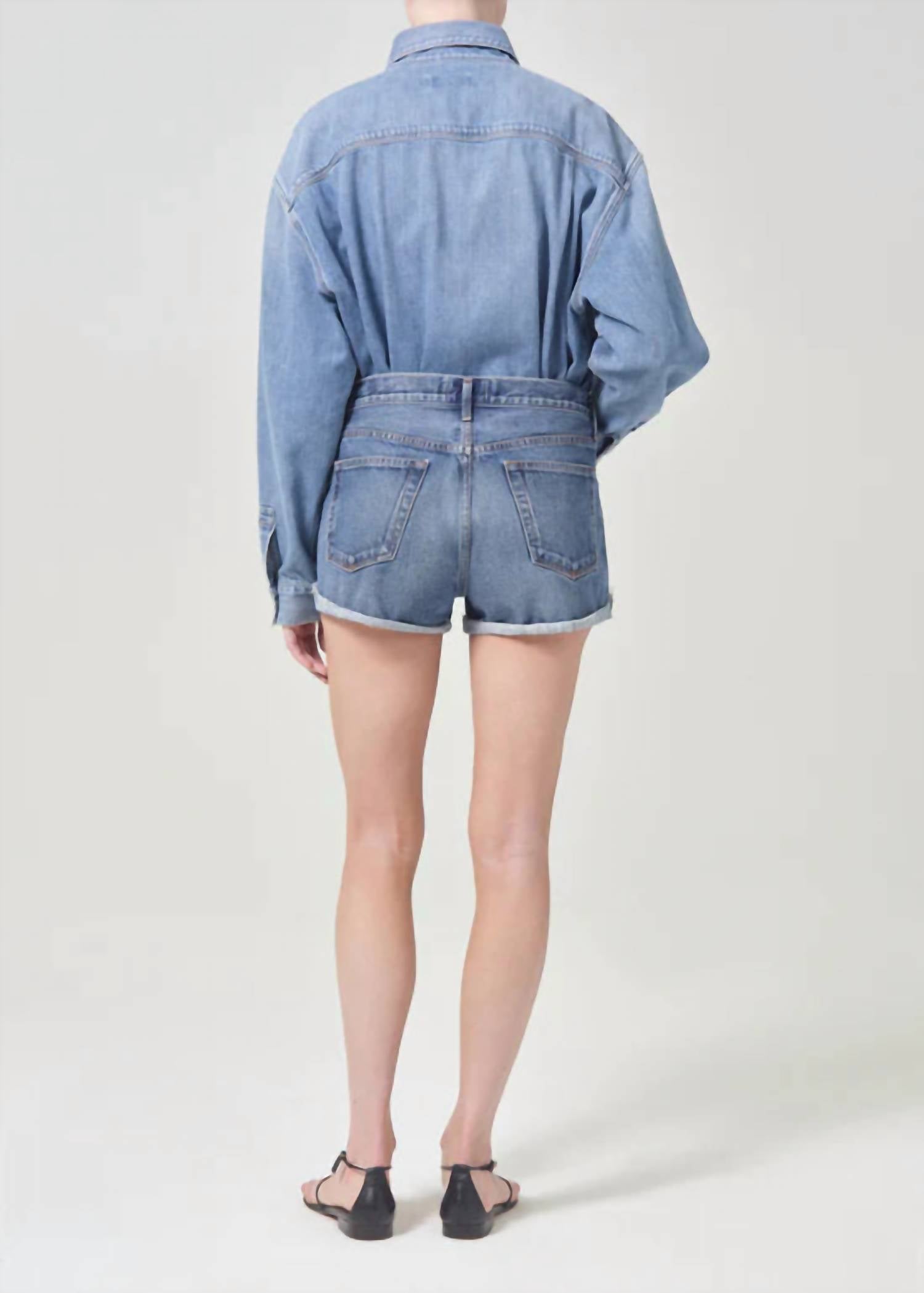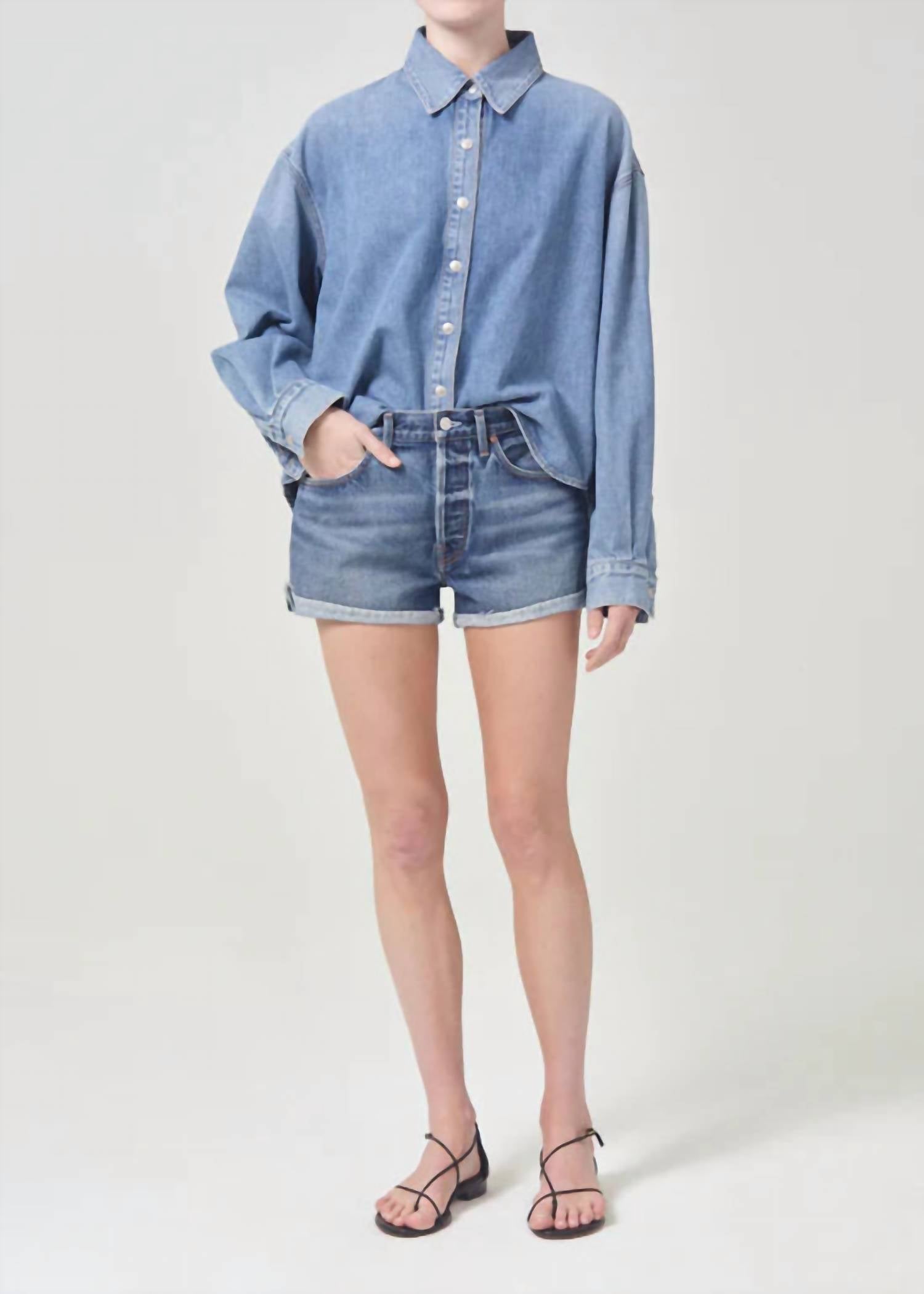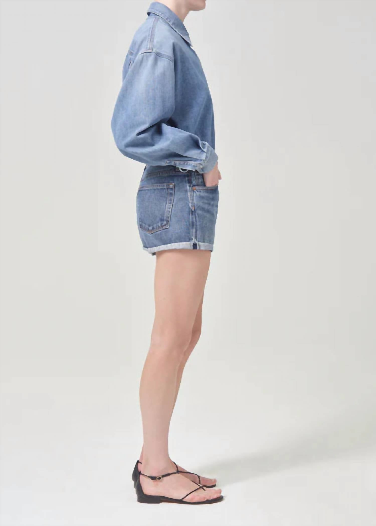 Not only cute but extremely comfortable. The jean shorts you will be reaching for all season long. Elevate your wardrobe with the AGOLDE Parker Rolled Short in a bright medium indigo shade called Ruin. Featuring a flattering high-rise fit, these shorts have a relaxed silhouette through the hips and a subtle rolled hem for vintage charm. Crafted from organic regenerative cotton, they promise to grow softer with each wear. Closure: Button closure. Care: Machine wash and tumble dry. Available in sizes 25 through 29, true to size, perfect for a casual Beach Day or embracing 90s fashion this Spring.