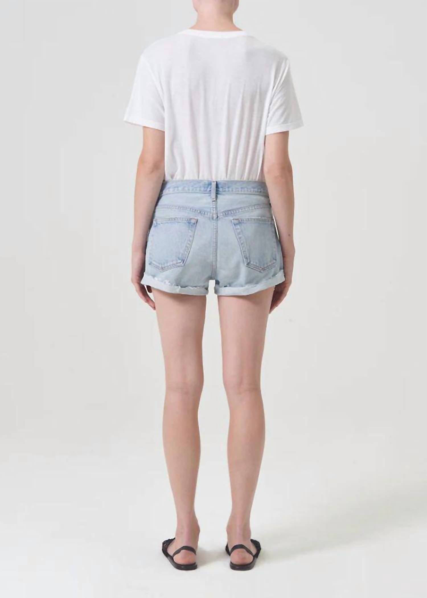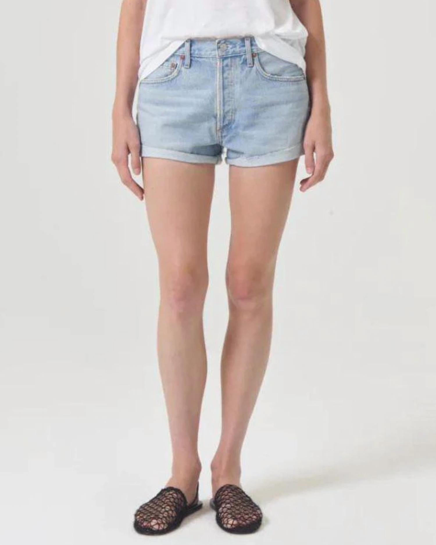 Jean shorts so versatile, you can literally wear them with anything. Discover the AGOLDE Parker Short in Farewell, expertly designed for women who appreciate style and comfort. These jean shorts feature a solid pattern with a flattering high rise and a relaxed fit through the hips. The rolled hem adds a contemporary touch to this wardrobe staple. Closure: Button closure.