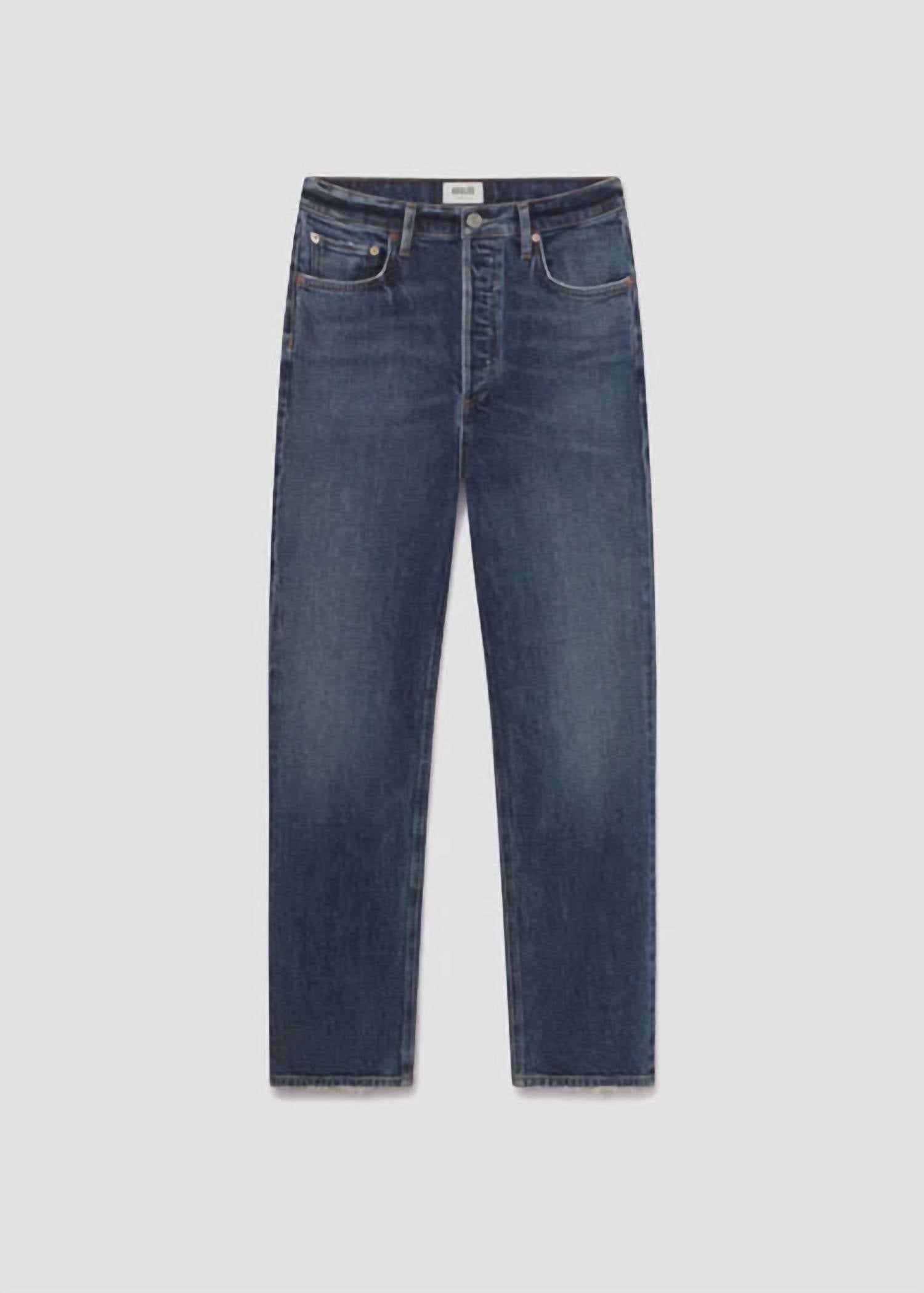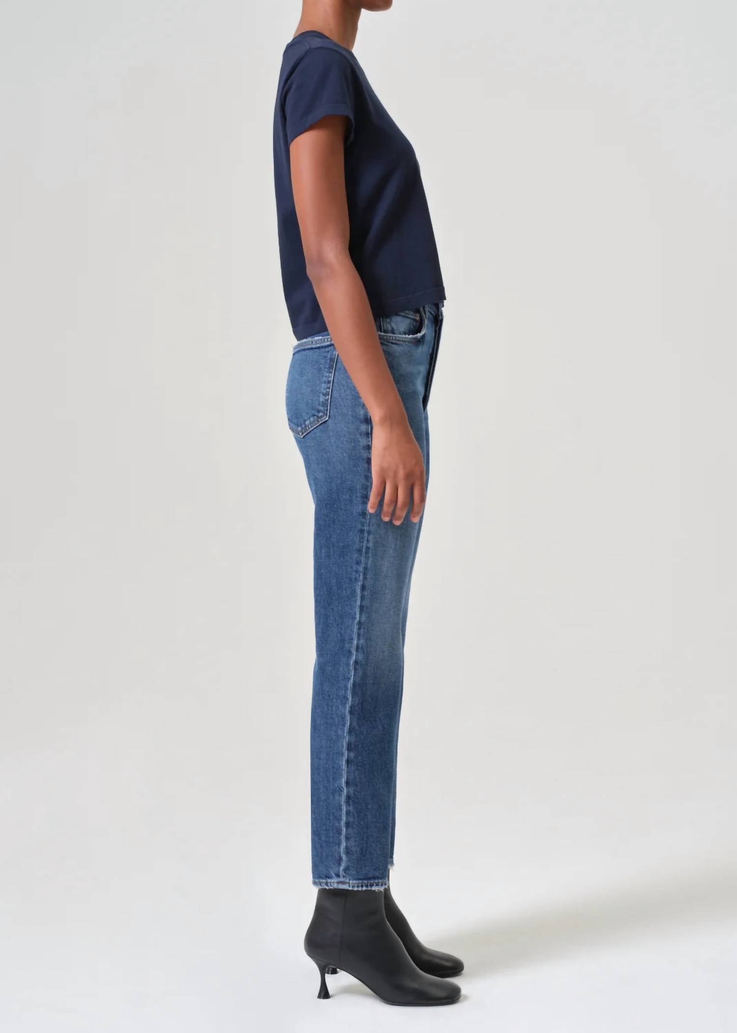 This straightleg pant is both stylish and comfortable. Did we mention the fit is perfection? Elevate your denim collection with the 90's Pinch Waist Crop Jean by AGOLDE, crafted from a sustainable blend of 99% Regenerative Cotton and 1% Elastane in the shade Solace. Flaunting a high-rise waist and a close-fitting top block through the hips, these jeans feature a classic straight leg with a cropped inseam. Closure: Zip closure. Care: Machine wash cold inside out, tumble dry low.