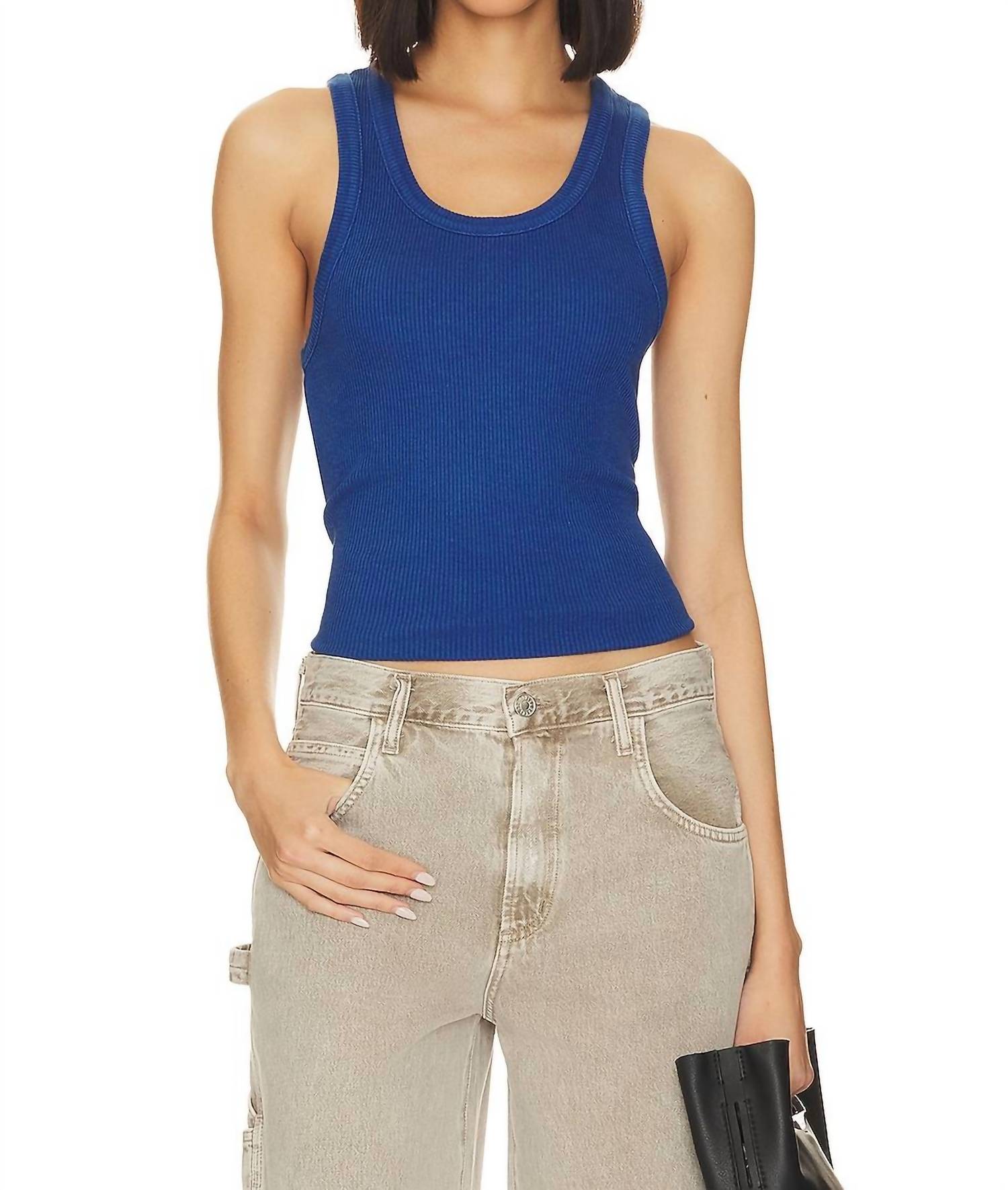 This tank top features a scoop neck and is crafted from ribbed jersey fabric for a comfortable fit. Made from 49% organic cotton, 49% lyocell, and 2% spandex, it is machine washable. Made in the USA.