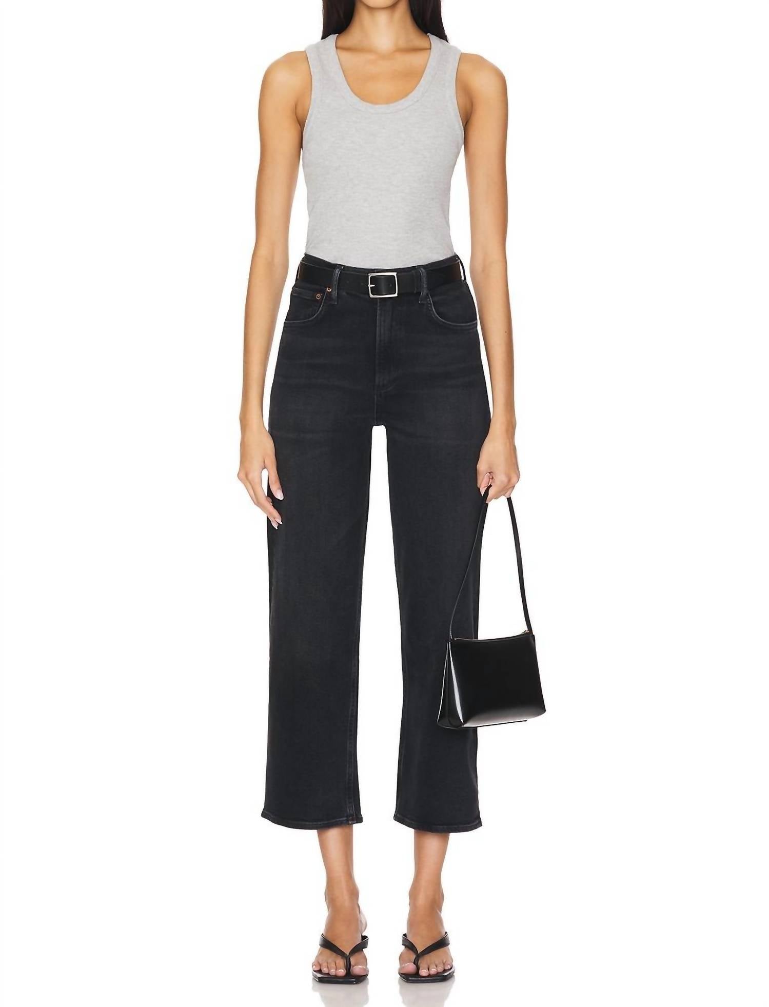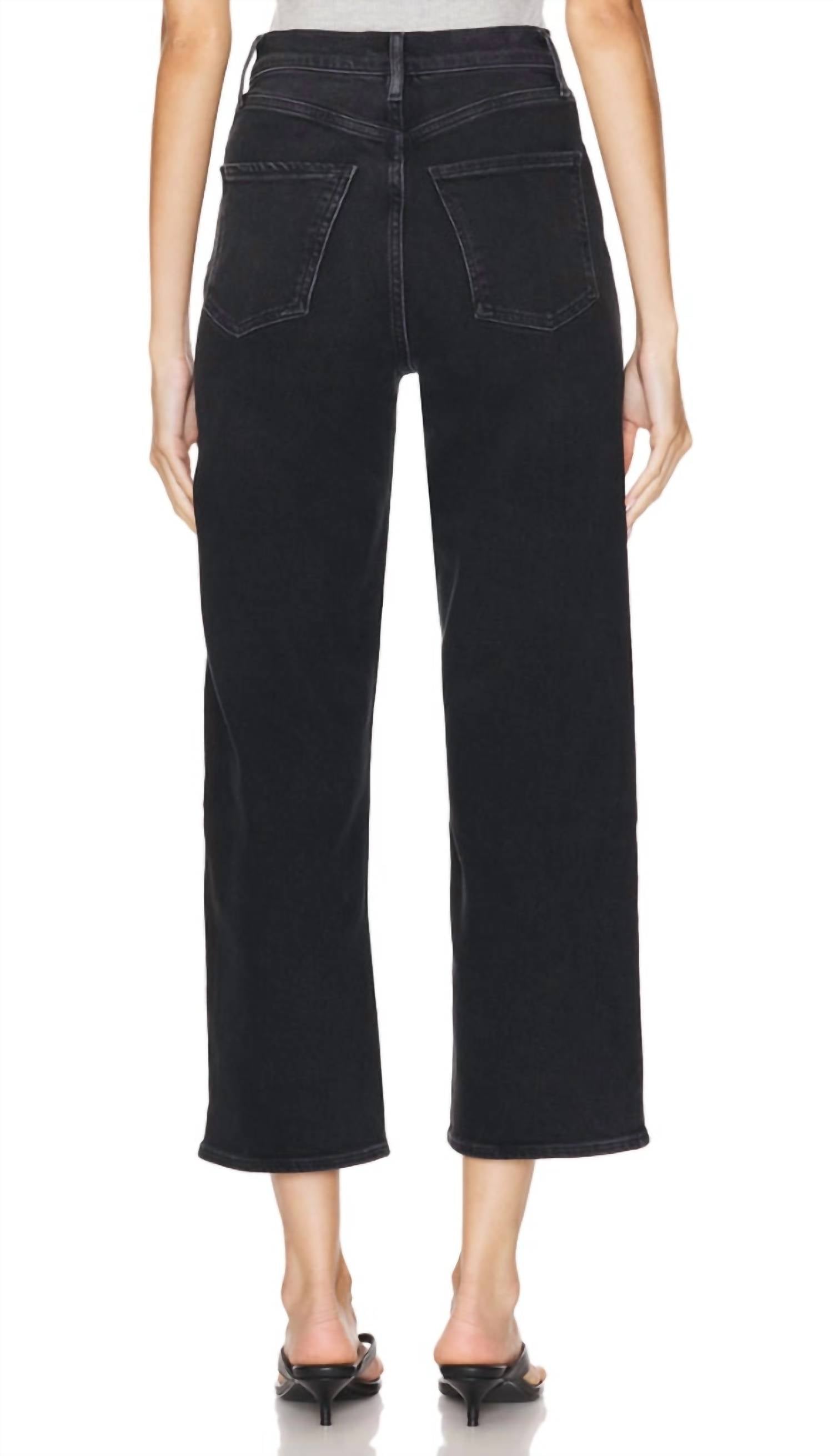 Just as cute as they are comfortable. Introducing the Ren High Rise Wide Leg Jeans by AGOLDE in the Hush color, an essential piece for your wardrobe with a nod to '90s fashion. These jeans feature a high-rise waist and relaxed fit with a flattering 27-inch inseam, while the leg opening is 9 inches wide, providing a stylish silhouette. Made from a cotton blend, they come in a dark wash with a solid pattern, offering a soft, weightless stretch that retains its shape. Closure is secured by a zip fly with a button, and they feature versatile 5-pocket styling. Care is simple with machine wash and tumble dry instructions.