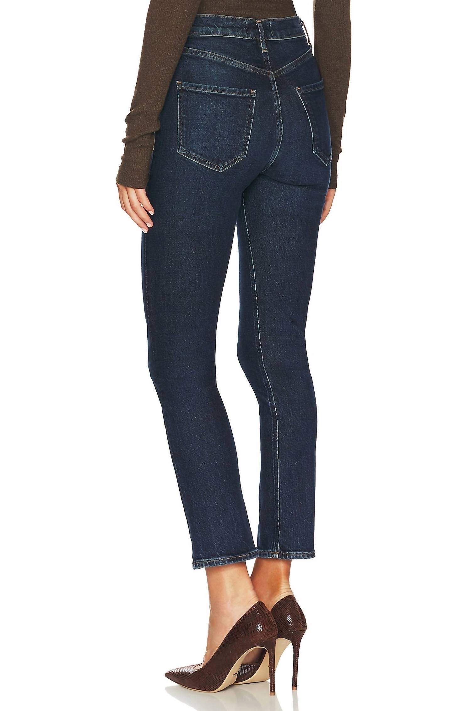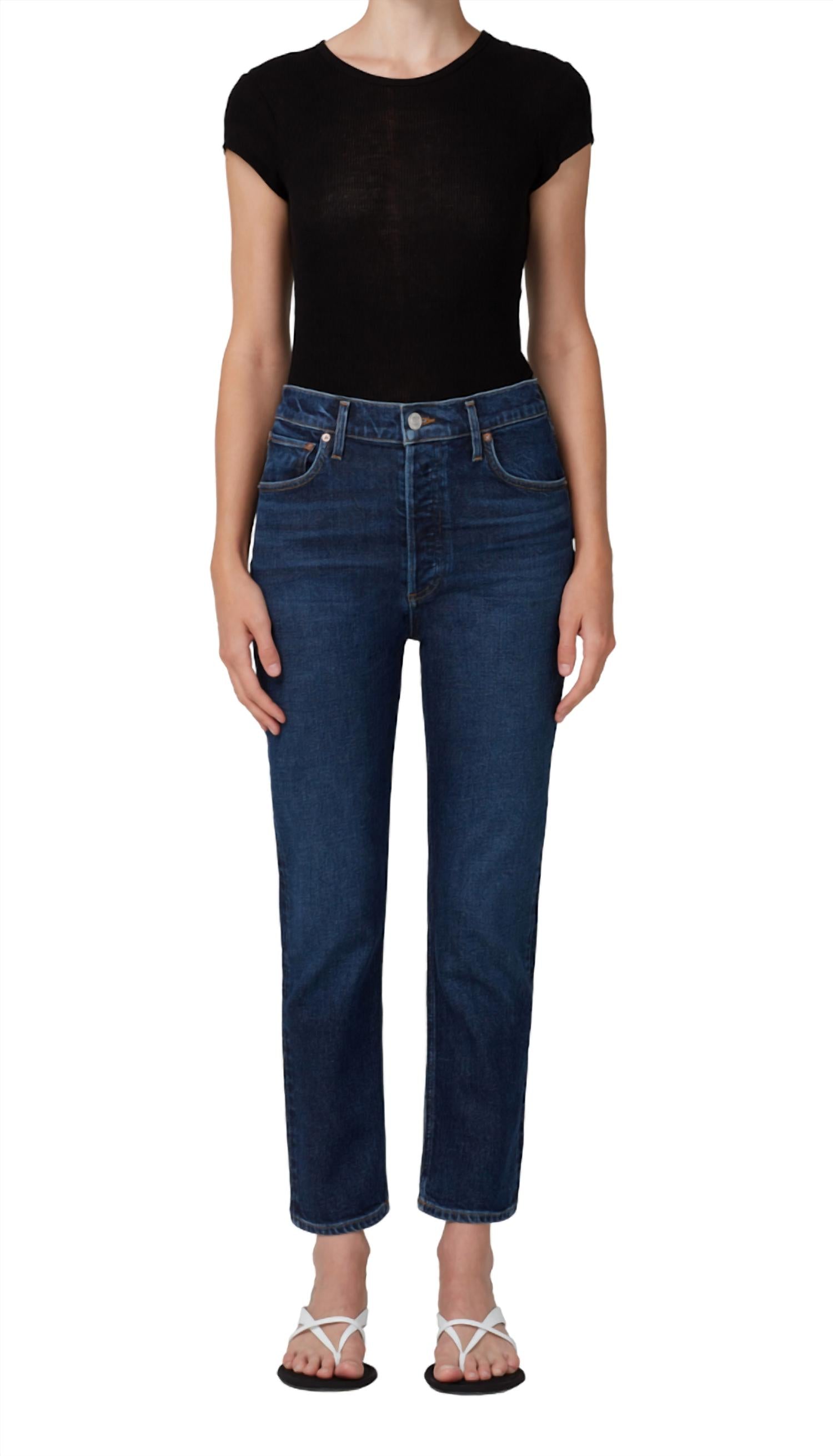 Pair these straight leg jeans with flats, sandals or even heels! You can't go wrong. Presenting the AGOLDE Riley Crop in Divided, a chic addition to your summer wardrobe with its contemporary high-rise design. Crafted from premium cotton in Turkey, this pair of straight leg jeans features a solid dark wash that offers a sleek silhouette and practicality with pockets. Designed with a waist rise of 11.5 inches, these jeans provide the perfect blend of comfort and style. Care instructions include machine wash and tumble dry for easy maintenance.