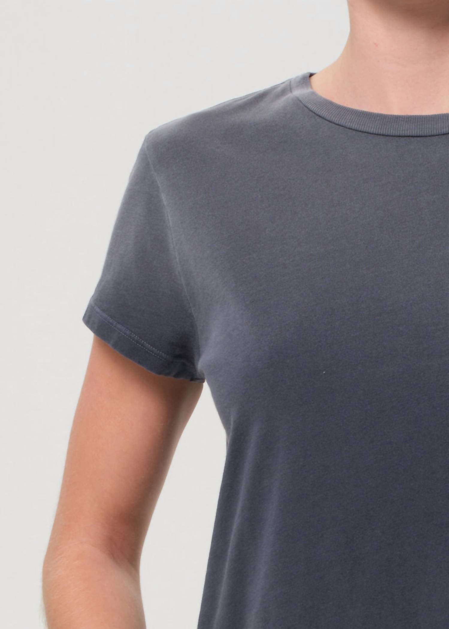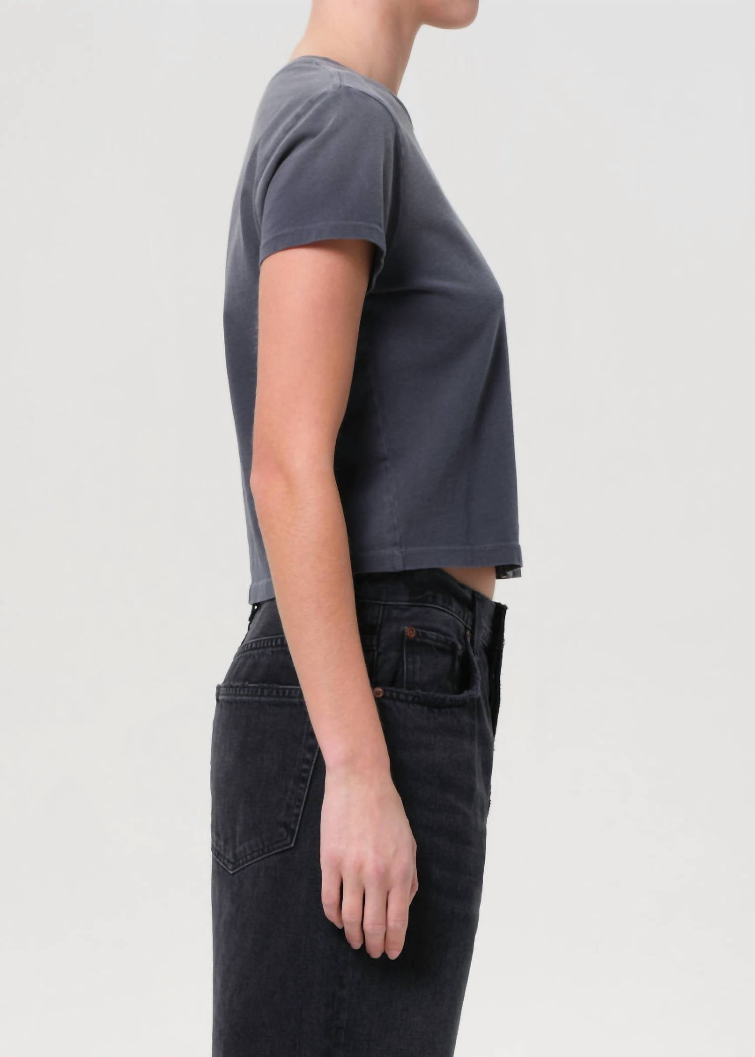 The short sleeve tee you'll want in every color. The AGOLDE Shrunken Tee Top in Windstorm is a minimalist, timeless piece designed for versatility and comfort. Featuring short sleeves and crafted from breathable organic cotton, it offers a soft touch and is perfect for layering or wearing solo. Closure: Pull on, with a classic crewneck design. Care: Machine wash. Ideal for back-to-school fashion.