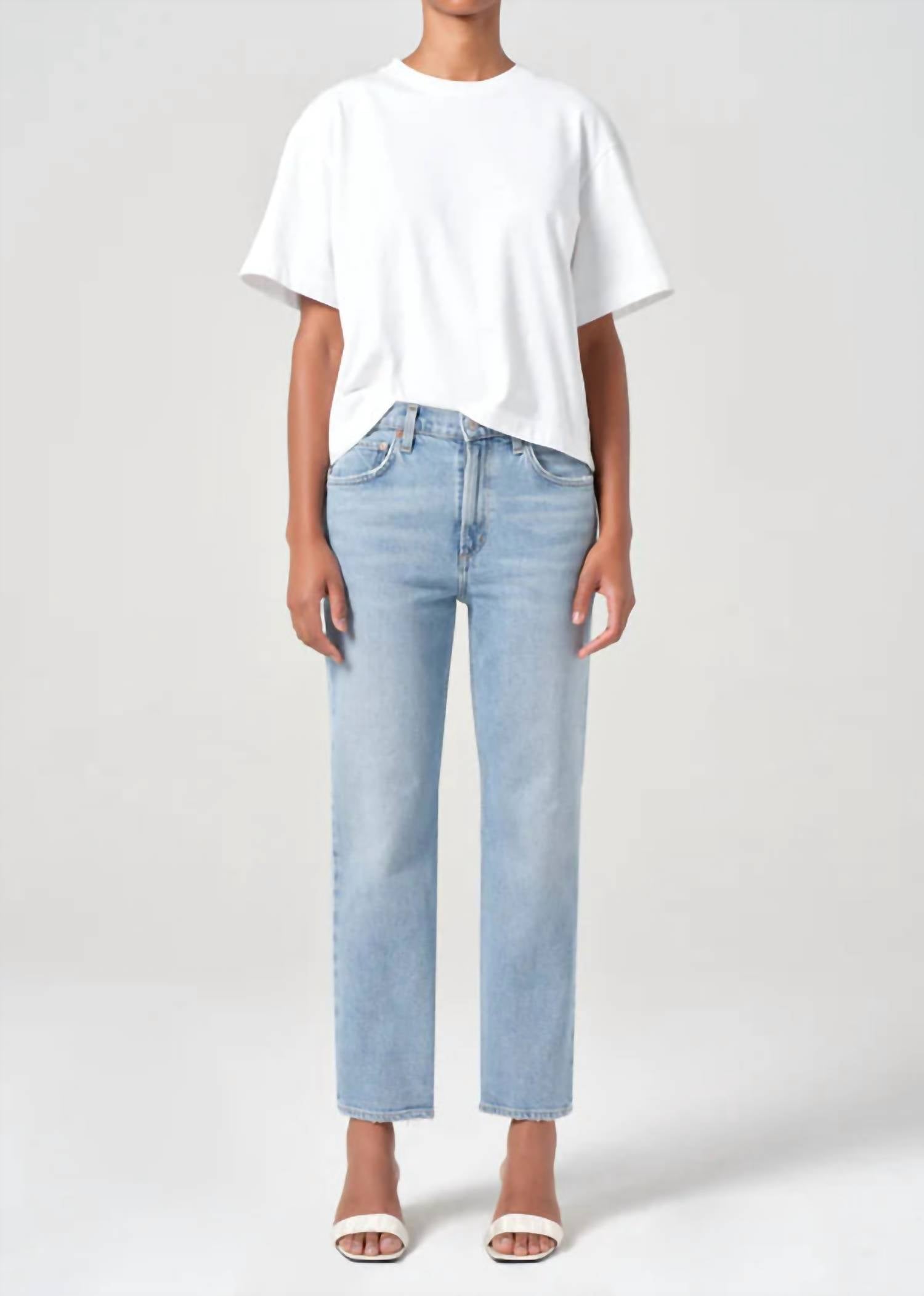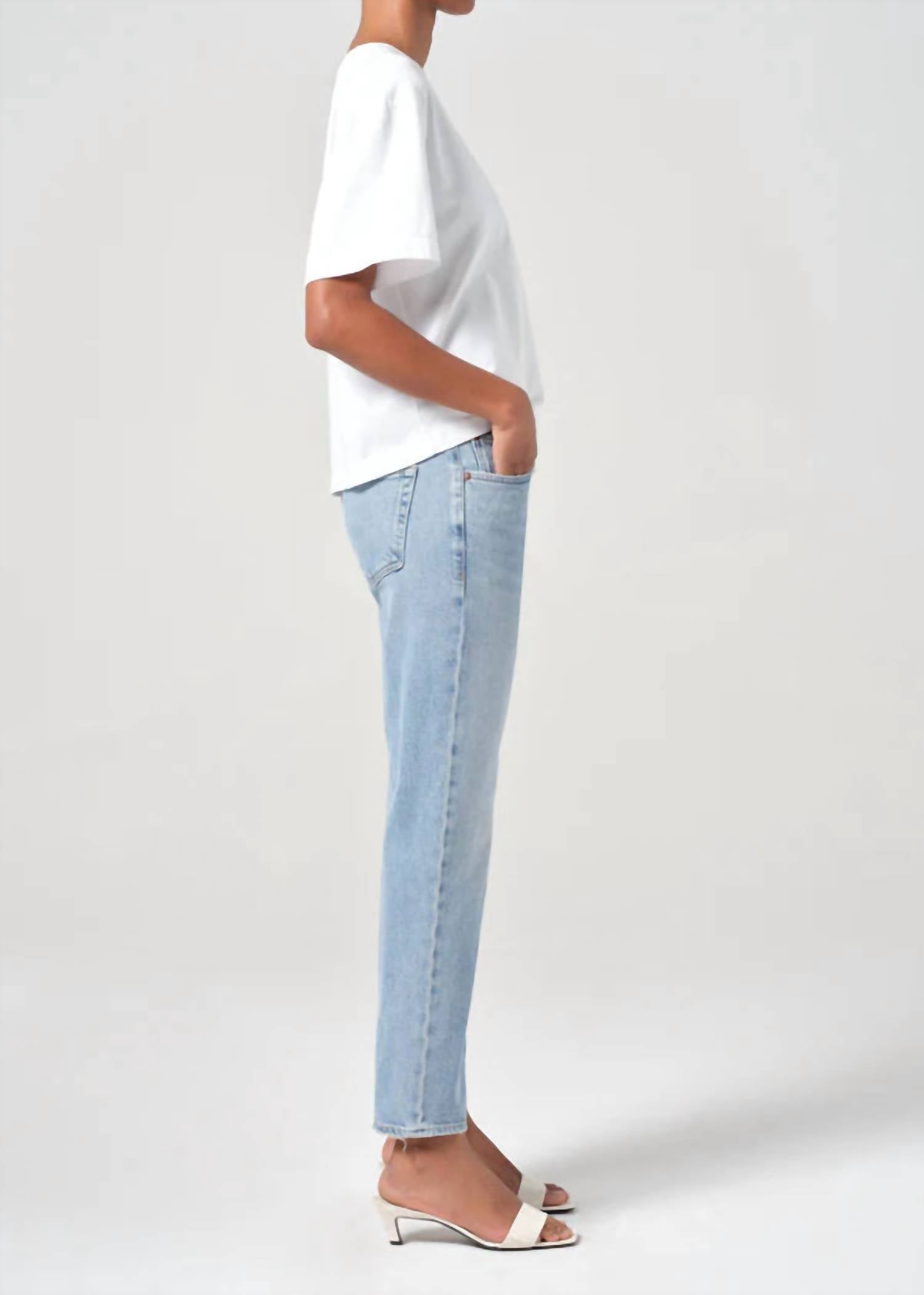 Introducing the Valen Jean by AGOLDE, a perfect blend of style and comfort with its mid-rise and straight-leg silhouette. This denim is crafted from 99% Regenerative Cotton and 1% Elastane, offering a soft hand feel and comfort stretch. Featuring a flattering 11" rise and a 28.5" inseam, these jeans are finished in a light wash "Formula" shade with whiskering and fading for a vintage touch. Closure: Zipper fly. Care: Machine wash cold inside out with like colors, do not bleach, and tumble dry low. Model is 5'10" and wears a size 27.