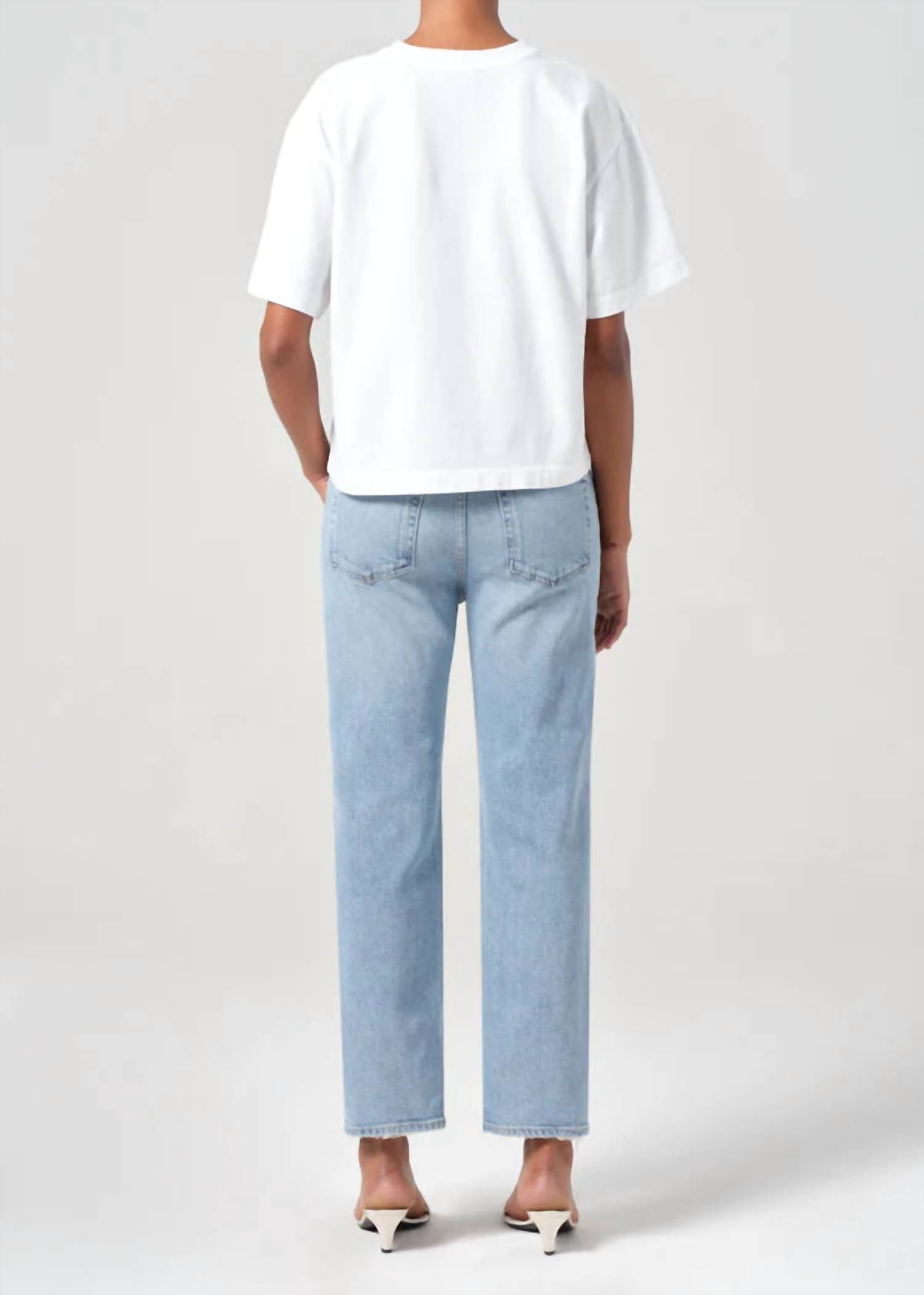 These must-have jeans are fit to perfection. Introducing the Valen Jean by AGOLDE, a perfect blend of style and comfort with its mid-rise and straight-leg silhouette. This denim is crafted from 99% Regenerative Cotton and 1% Elastane, offering a soft hand feel and comfort stretch. Featuring a flattering 11" rise and a 28.5" inseam, these jeans are finished in a light wash "Formula" shade with whiskering and fading for a vintage touch. Closure: Zipper fly. Care: Machine wash cold inside out with like colors, do not bleach, and tumble dry low. Model is 5'10" and wears a size 27.