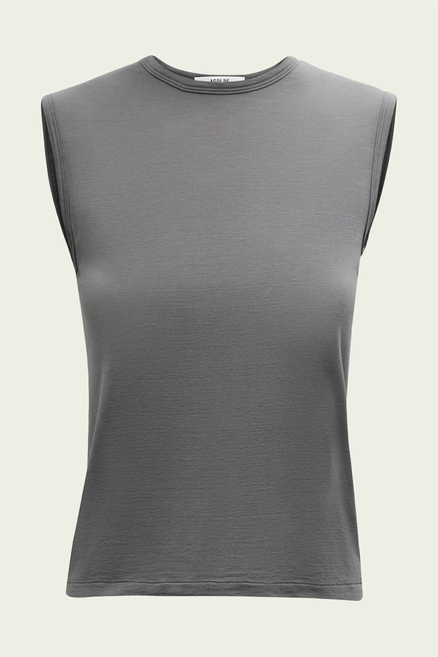 This muscle tee isn't just for the gym. Pair it with your favorite jeans for the perfect casual-cool vibe. Meet the Women's Nikita Shrunken Muscle Tee by AGOLDE, a sleek and versatile piece perfect for any streetwear collection. Crafted with a composition of 94% Tencel and 6% Spandex, this sleeveless tee in a solid Gravel hue offers a flattering fit. Made in Turkey, it features a comfortable crewneck design with an easy pull-on closure. Care instructions are simple with machine wash recommended.