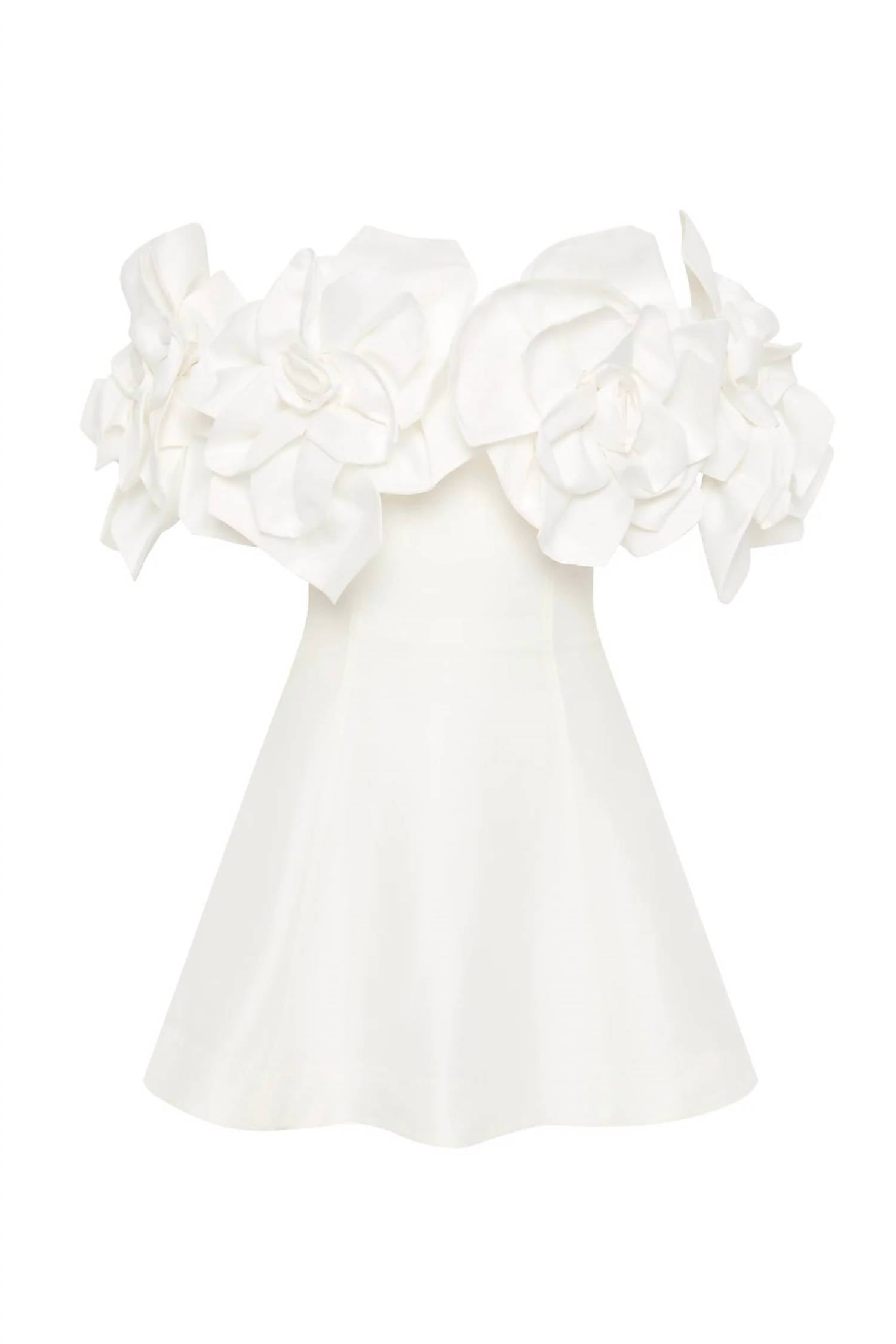This women's mini dress features a flattering fit-and-flare silhouette with an off-the-shoulder design and floral detail at the neckline. It includes internal bodice boning for added structure, stretch sleeve cuffs for comfort, and a zip with hook-and-eye closure. Fully lined and crafted from a breathable linen-viscose blend, it offers both style and ease.