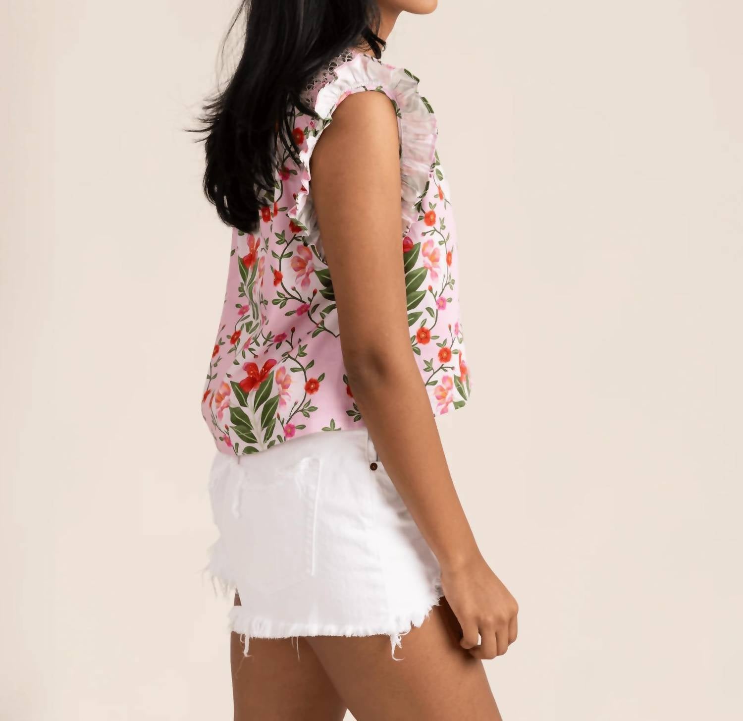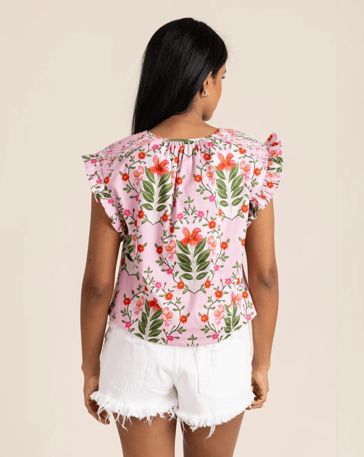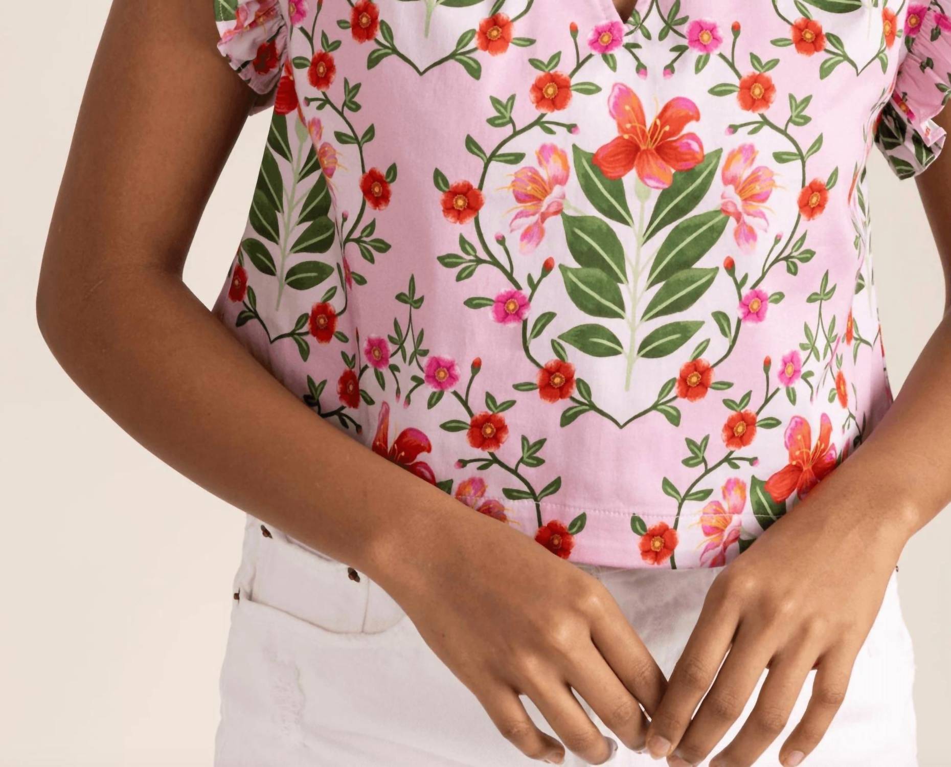 A versatile blouse that works from desk to dinner! Step into summer with the Gigi V-neck Top by Alden Adair, a vibrant choice in Pink Bouquet with a playful floral pattern. This cotton blend blouse features short cap sleeves with smock detailing, delivering a boxy fit for ultimate comfort and style. Composition: 98% Cotton, 2% Spandex. Closure: Pull on. Care: Machine wash cold, tumble dry low. Model is wearing a size Small. Perfect for vacation or any boho chic occasion.