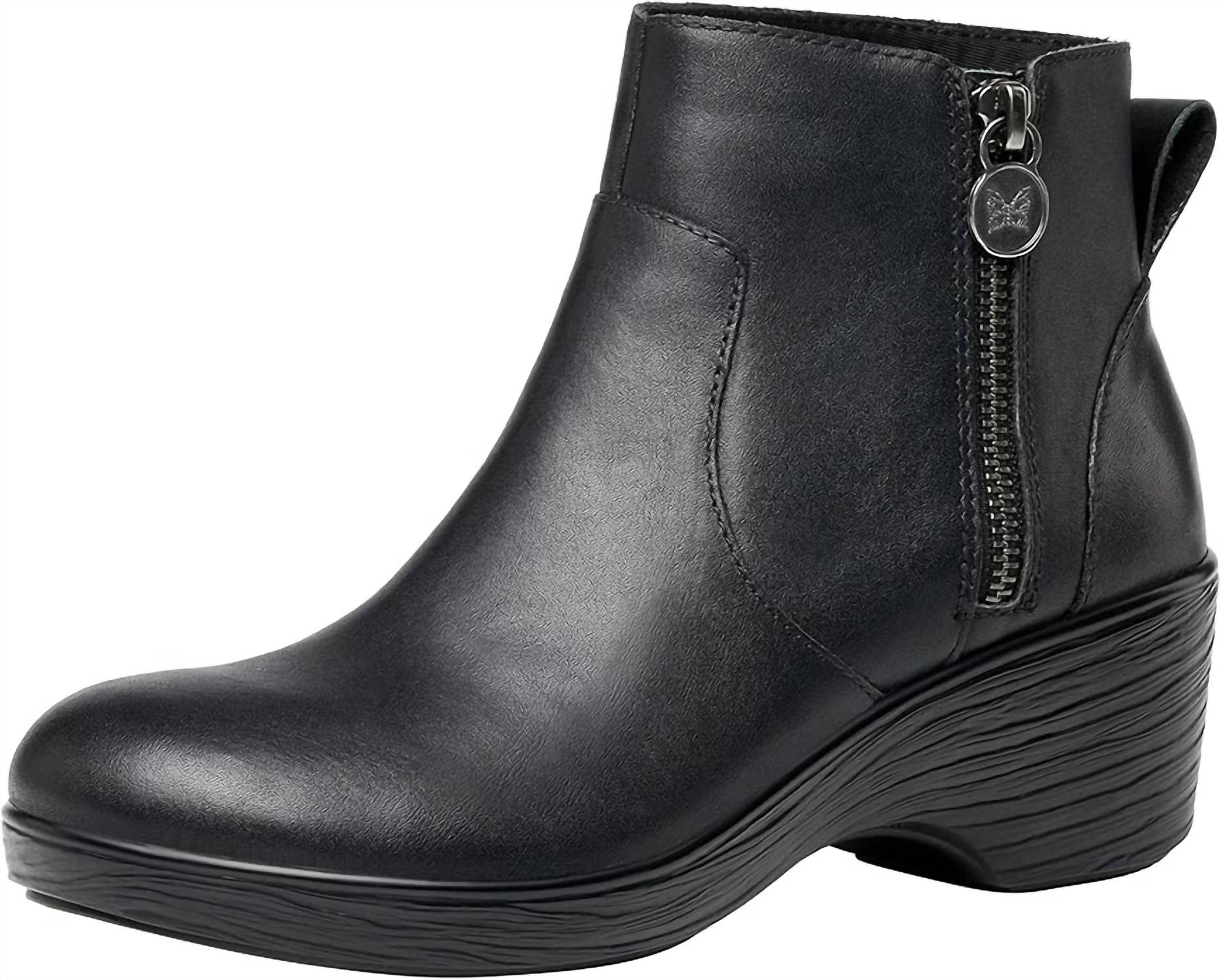 Say hello to the perfect, most versatile boot. The ankle height makes this style easily transition from day to night. Wear them with your favorite skinny jeans and tee for a more laid back look, or pair them with your favorite mini dress and jacket for a night out on the town. Experience comfort and style with the Serina Ankle Boots by Alegria, designed in a sleek black hue. Made with a luxurious leather or leather hair calf combination, they feature a warm, cozy lining ideal for all-day wear. Equipped with an outside zip adorned with a charming butterfly detail, these boots offer easy access, while the slip-resistant outsole ensures a secure stride. Featuring a wedge heel with a low height of 2 inches, they're perfect for adding subtle lift without compromising comfort.