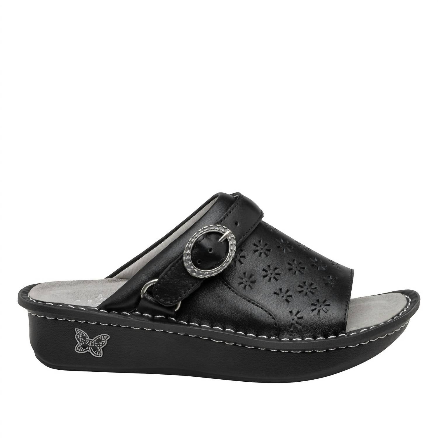 This sandal will take you from brunch to dinner and everything in between. Discover the Alegria Women's Klover Sandal in elegant Black Butter, merging the best of a shoe and a sandal for versatile, minimalist style. This summer staple features an open toe design and a flat heel, complemented by a dainty perforated pattern on genuine leather. The hybrid style offers a swivel strap to easily convert from a backless shoe to a slingback, complete with a removable memory foam and cork footbed and a slip-resistant rocker outsole for ultimate comfort. Perfect for a dinner party occasion.