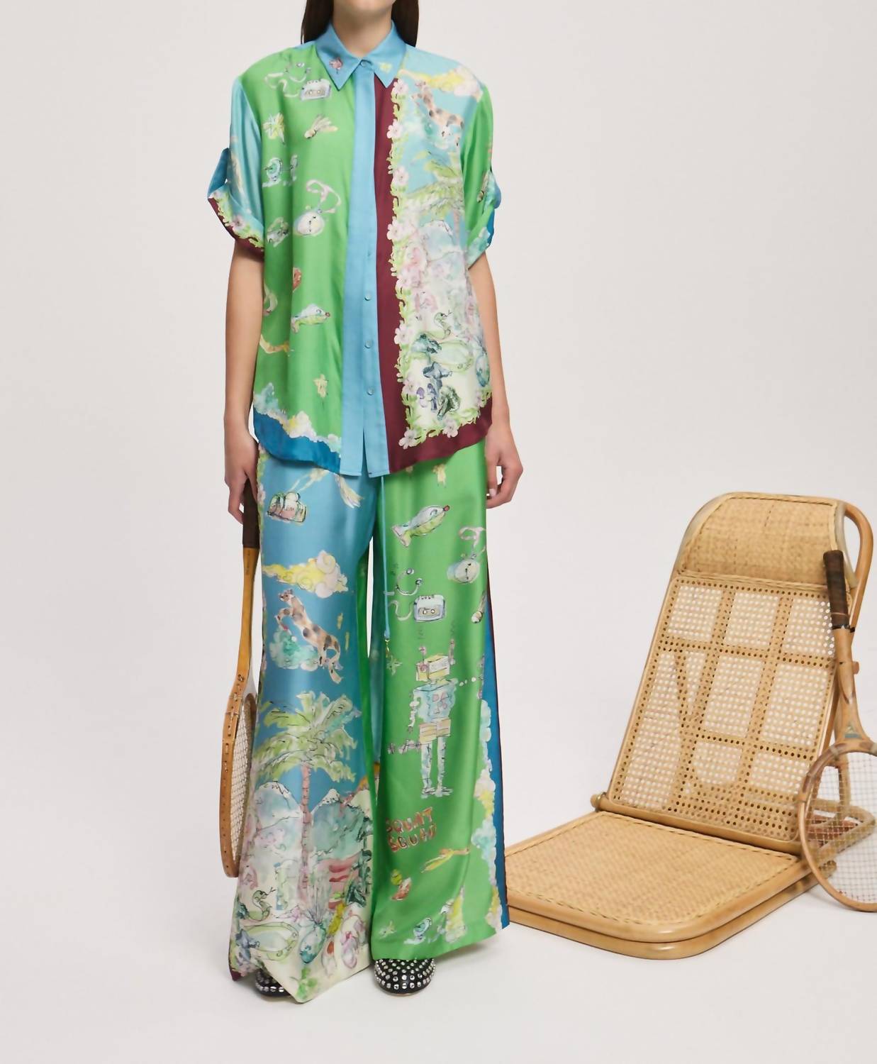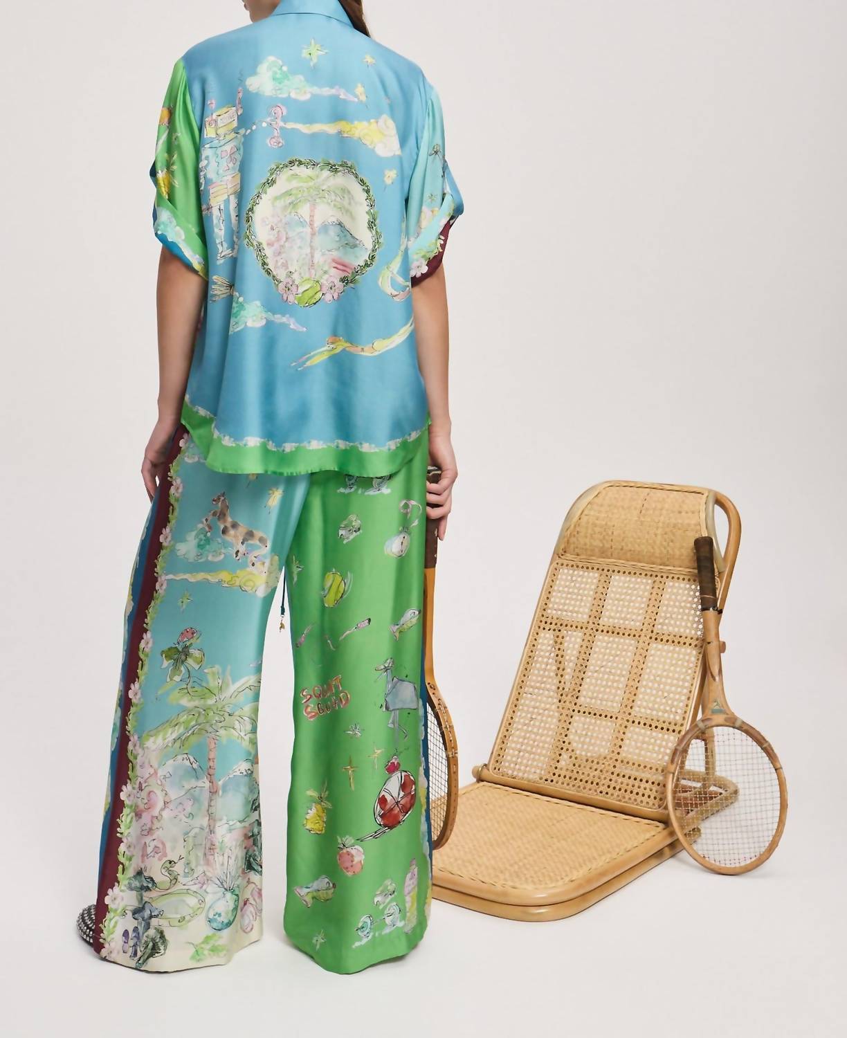 Perfectly tailored and soft to the touch. Elevate your wardrobe with the ALEMAIS Daria Silk Shirt, a timeless piece showcasing the elegant artwork of Anouk Colantoni. This oversized short-sleeve shirt is crafted from 100% Silk Twill and features a pointed collar with a concealed button closure for a polished look. Perfect for summer vacations, this multi-colored, patterned shirt adds sophistication to any outfit. Care instructions suggest dry cleaning only.
