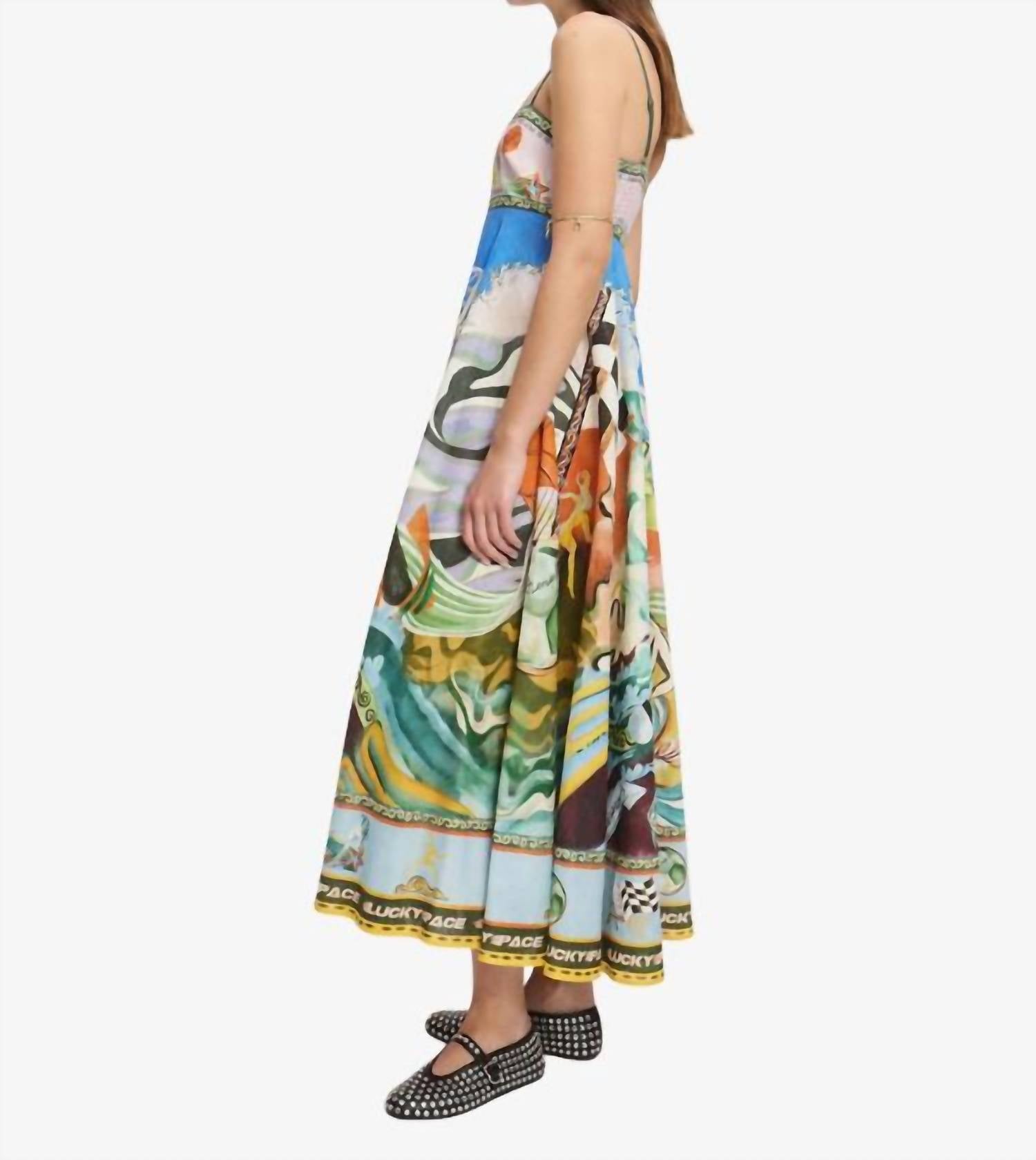 Embrace summer style with the Lucky Pace Midi Sundress by ALEMAIS, featuring an A-line silhouette with a square neckline and sleeveless design. Crafted from 100% linen, this patterned sundress in a multi-color palette is perfect for travel occasions. The dress includes adjustable spaghetti straps and an invisible side zip closure. Care is simple with hand wash instructions, allowing easy maintenance for your maximalist summer wardrobe.