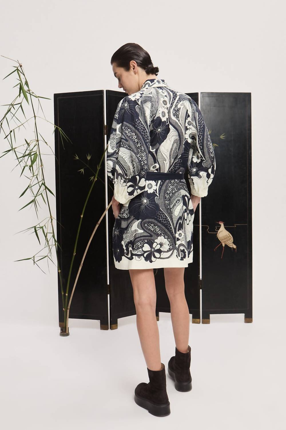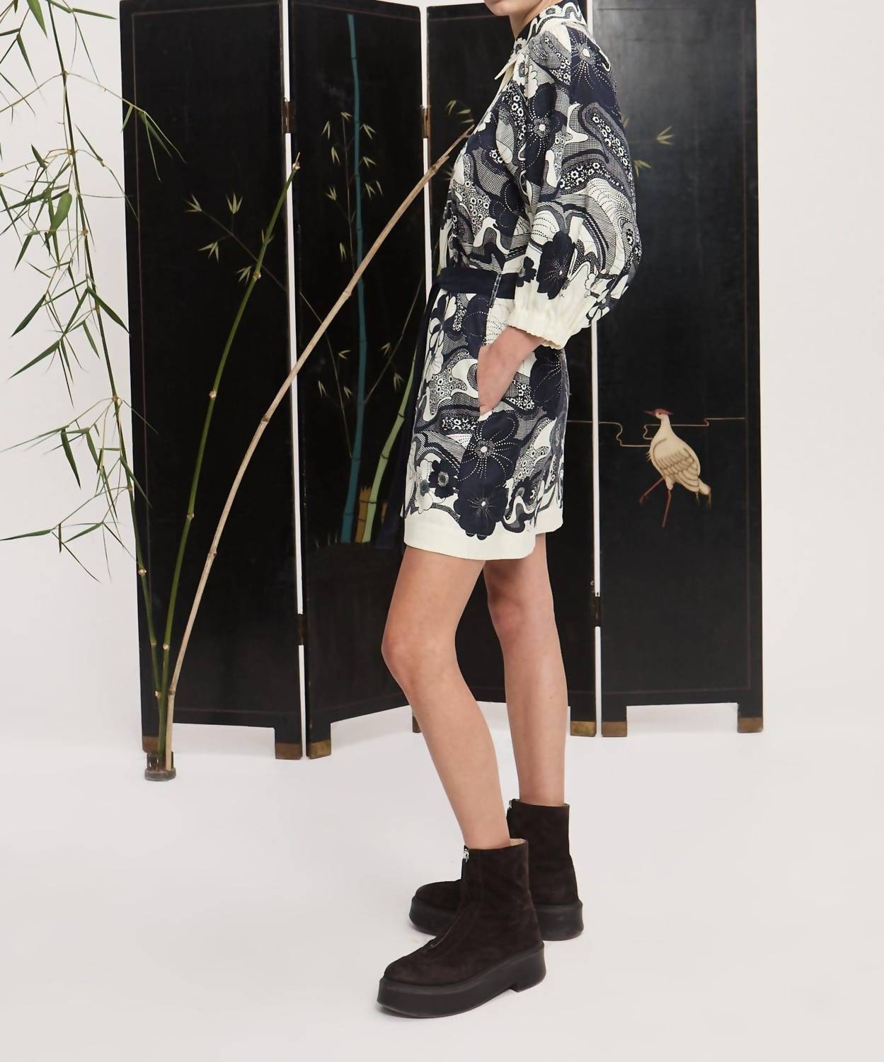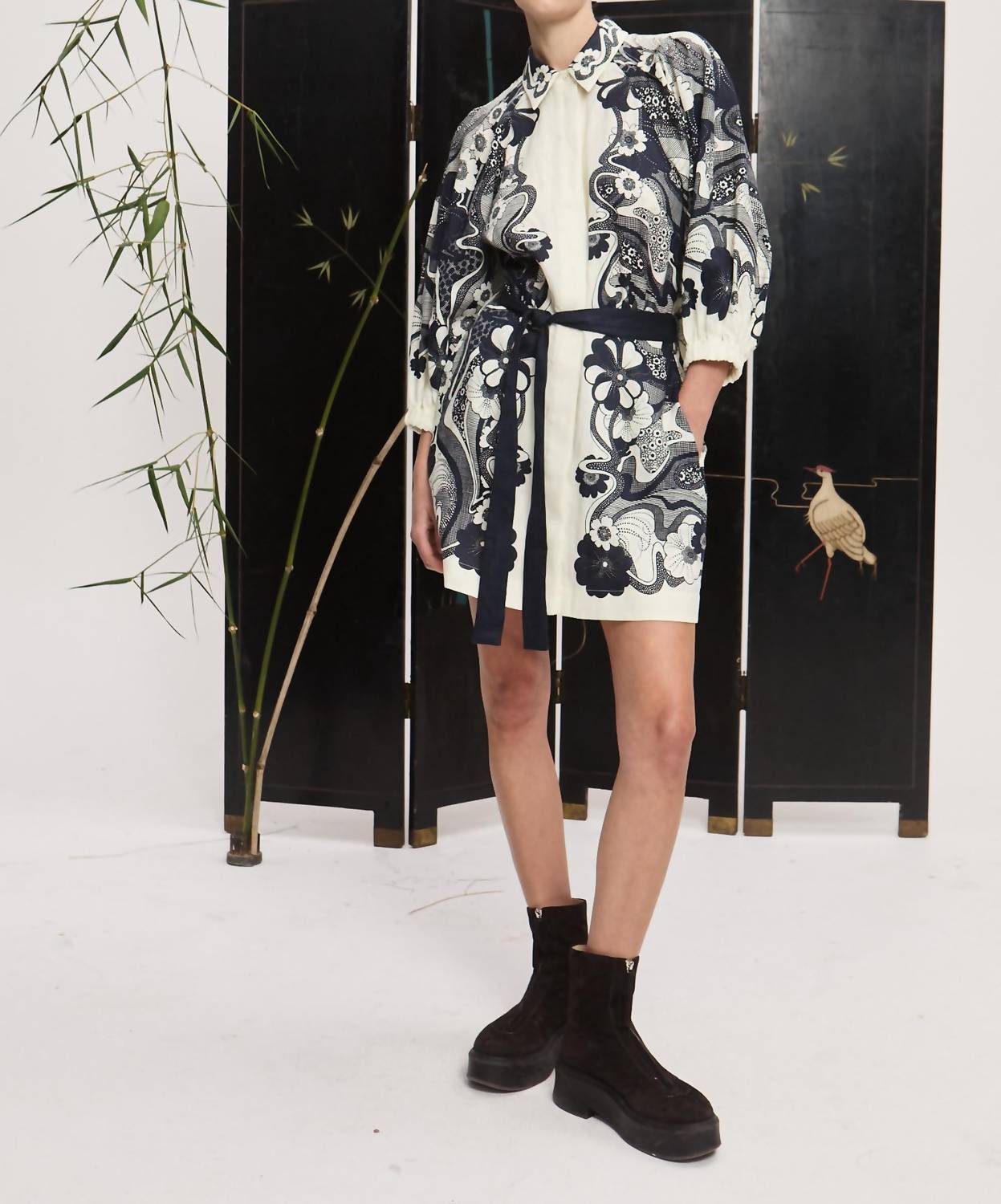 The kind of easy and flattering dress you'll be reaching for all season long. The Mickey Mini Dress by ALEMAIS in navy exudes Boho Chic vibes, perfect for a holiday party or that special Thanksgiving occasion. This A-line, patterned dress features long sleeves with tucks and elasticated cuffs, and a statement point collar. Made from 100% European Linen, it boasts a straight mini shirtdress silhouette with a self-tie belt for added style. Closure: Button closure. Care: Cold hand wash.