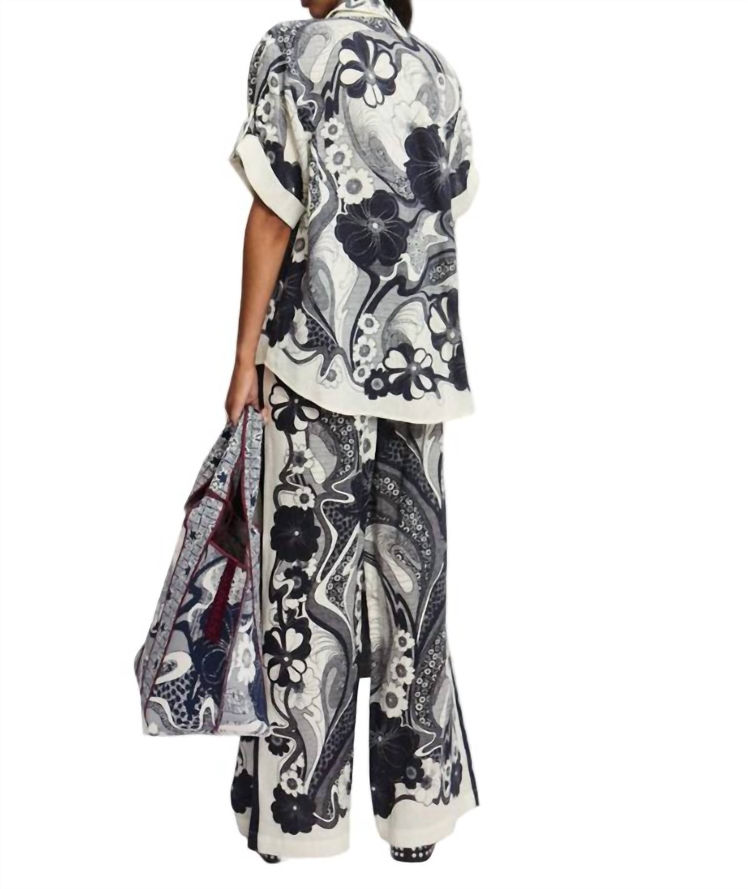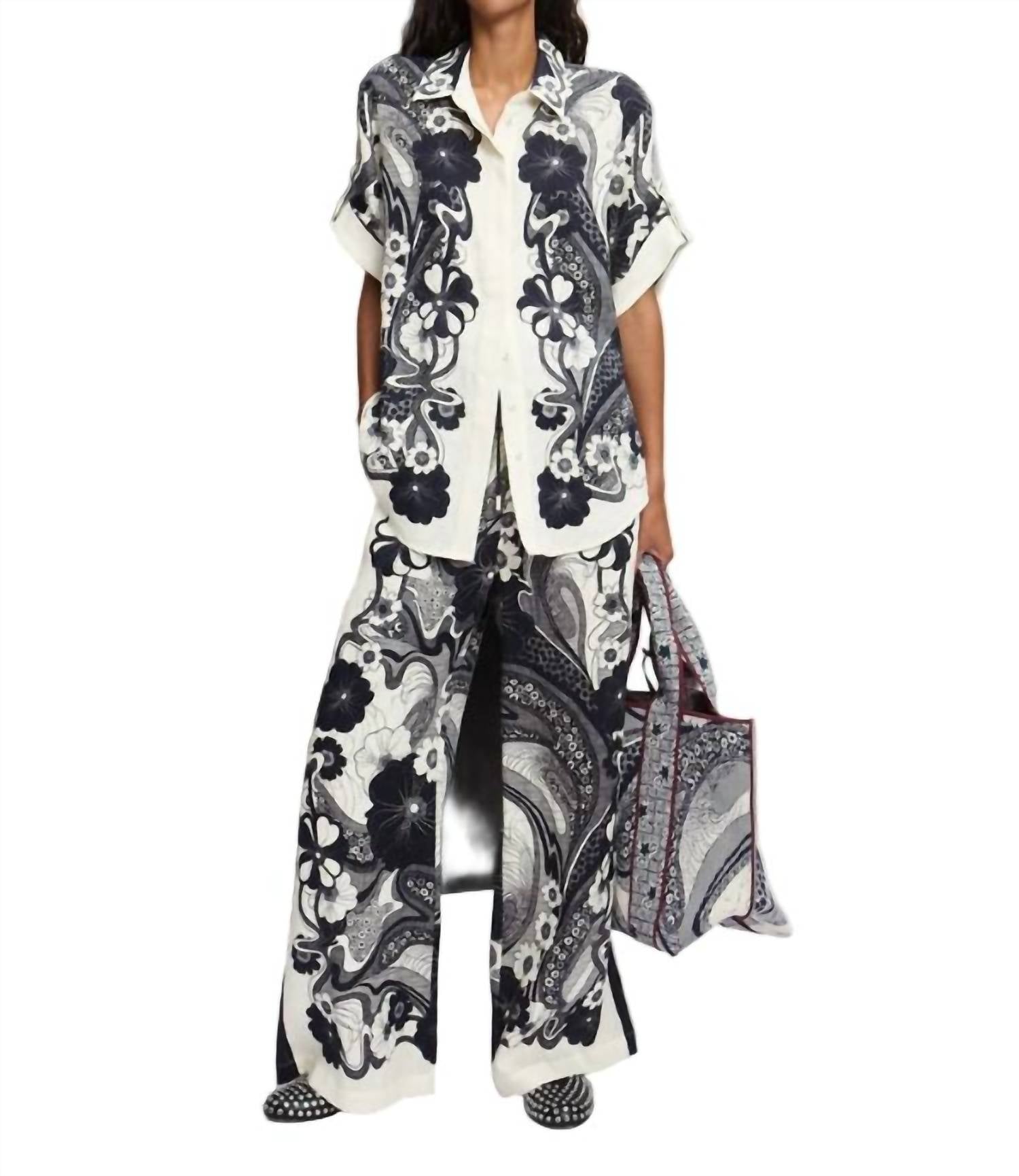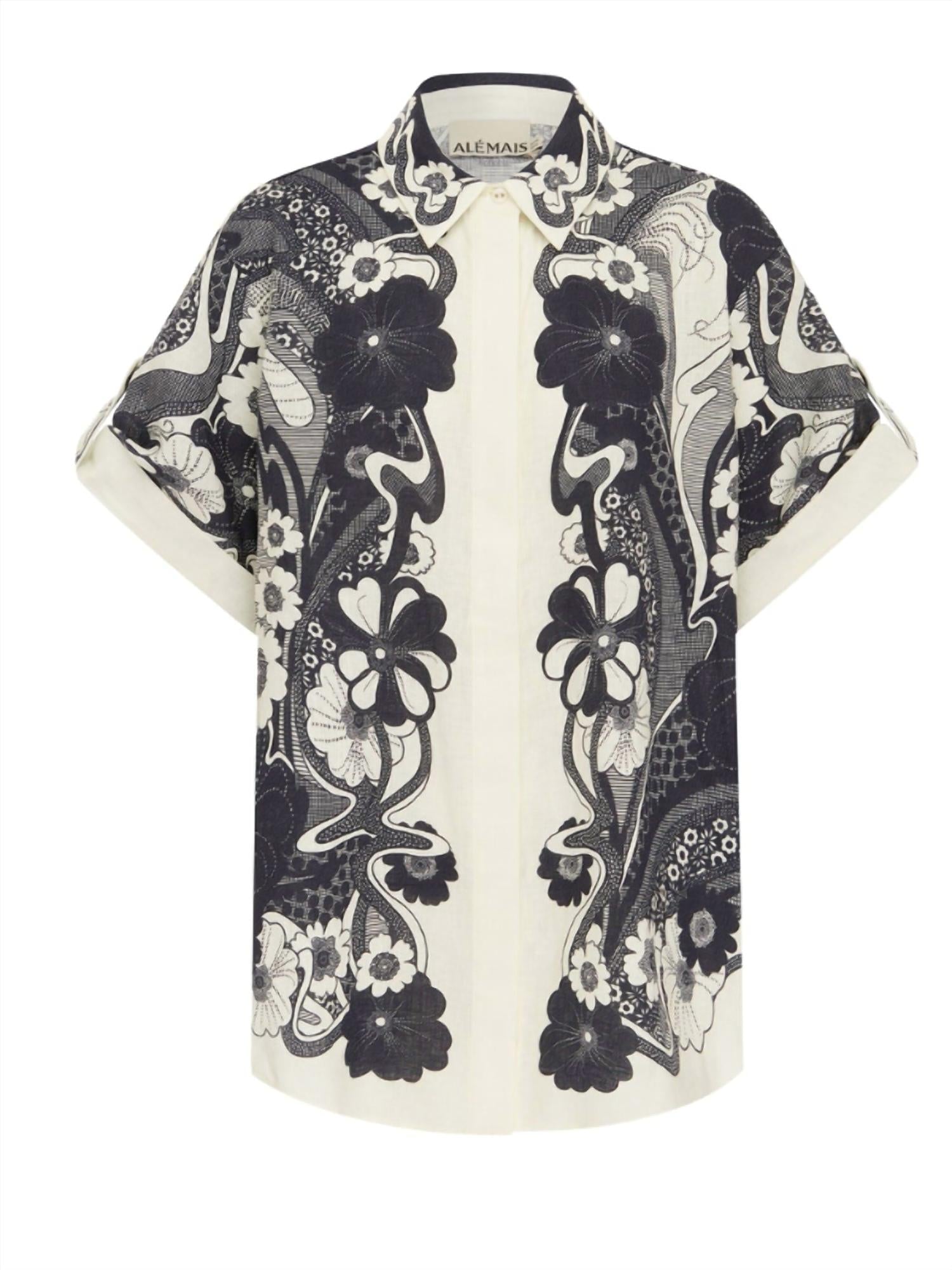 Pair this with your favorite jeans and slides for your next girls night out. Step into style with the Women's Mickey Shirt by ALEMAIS, perfect for a holiday party. This blouse comes in a rich navy color with a playful floral pattern, adorned with short rolled sleeves and a sophisticated collar neckline. Made from 100% European Cotton, it features a convenient button closure and exudes an effortless elegance. Crafted with care for the spring season, this piece is imported, offering both quality and chic design.