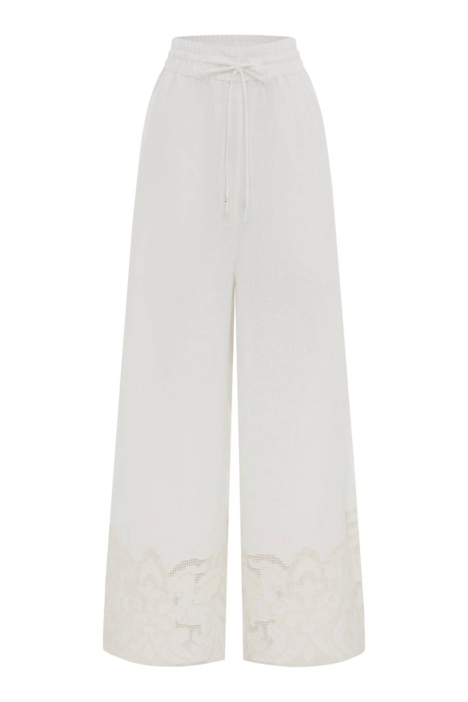 This straightleg pant is both stylish and comfortable. Did we mention the fit is perfection? Meet the Pegasus Embroidered Pull-on Pants by ALEMAIS, crafted with 100% European Linen in a chic Ivory hue. Boasting a mid-rise elasticated waist with ties and toggle ends, these straight-leg pants offer a relaxed fit with embroidered cut-out details on the hem. Designed as a true to size, cropped pant silhouette with convenient pockets, they align perfectly with streetwear trends for the summer, making them ideal for travel and holiday occasions. Care: Hand wash and line dry for lasting quality.